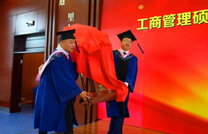 典礼进行第三项:经年花开,回忆流年。首先,在制作精美的视频短片中,同学回顾了两年来在管理公司学习与生活的点滴过往和欢声笑语。继而,毕业生代表2016级工商管理硕士马涛发表毕业感言,马涛同学分享了专业学位研究生的“兼得的哲学”,回忆了追求“工作和学习兼得、学习和生活兼得”过程中的收获与成长,对认真给予同学们指导和帮助的导师们表示真切的谢意。接下来,各系主任和系书记作为教师代表为毕业生们送上毕业寄语。老师们鼓励同学们在今后的人生道路上继续奋勇前行,追求卓越,开拓创新,成为商业模式创造者和引领者。老师们的谆谆教诲与殷切期望使员工们再一次感受到师恩如山,怀着深深的敬意,2018届MBA毕业生代表王铁、王柏松为公司献礼,张兴林书记、赵树宽经理代表公司共同接受了这座领航舵,并表示公司必将承载同学们的信任驾风远航。