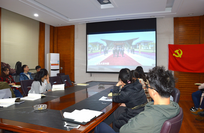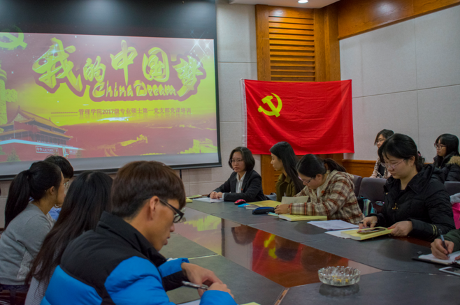 10月23日晚19时,9428cn太阳集团古天乐管理公司2017级专业学位硕士研究生第一党支部按照《管理公司党委关于在员工(含研究生)党支部中开展“旗帜工程—三个一活动”的通知》的要求,组织了主题为“我的中国梦”的党课学习活动,活动于管理公司第一会议室如期举行,党支部书记李林,副书记贺鸣迪,组织委员穆晓琛,宣传委员李德源,青年委员钱雪满及全体党员出席了本次会议,会议由李林书记和贺鸣迪副书记主持。