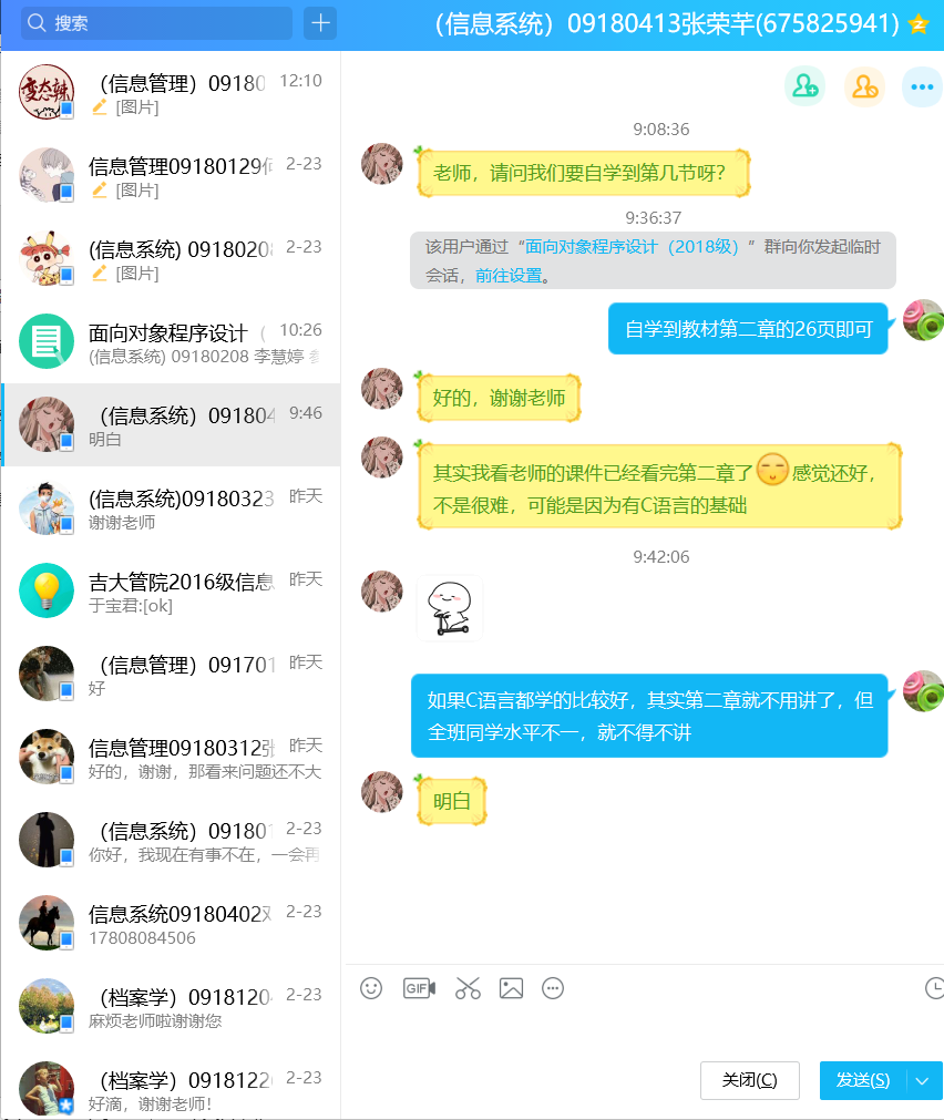 第一节课后,老师布置了自学第二章中的一节——“Java基本数据类型”的课后任务,第二天,信息系统专业18级的张荣芊同学通过QQ向老师反馈学习感受“因为有C语言的学习基础,整个第二章自学起来感觉都不困难”。老师迅速地根据这个反馈意见,通过QQ群要求大家自学整个第二章,并在周五之前,通过投票的方式,反馈这一章中每个主题掌握的情况。进而根据大家的学习情况反馈,及时地调整讲课内容和课堂计划。