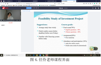 任伶老师的“投资项目可行性研究”是一门双语教学课程,理论性和实践性都很强,专业词汇也较多,线下课堂教学对同学们已经有一定的挑战。在这次的线上教学中任伶老师将课程内容细分成知识点,采用“直播软件录课用”的方式,既能够有效规避直播平台不稳定的风险,又让同学们在学习时能够看到老师,尽量减少“满屏英文专业词、对面员工一脸懵”的状况。