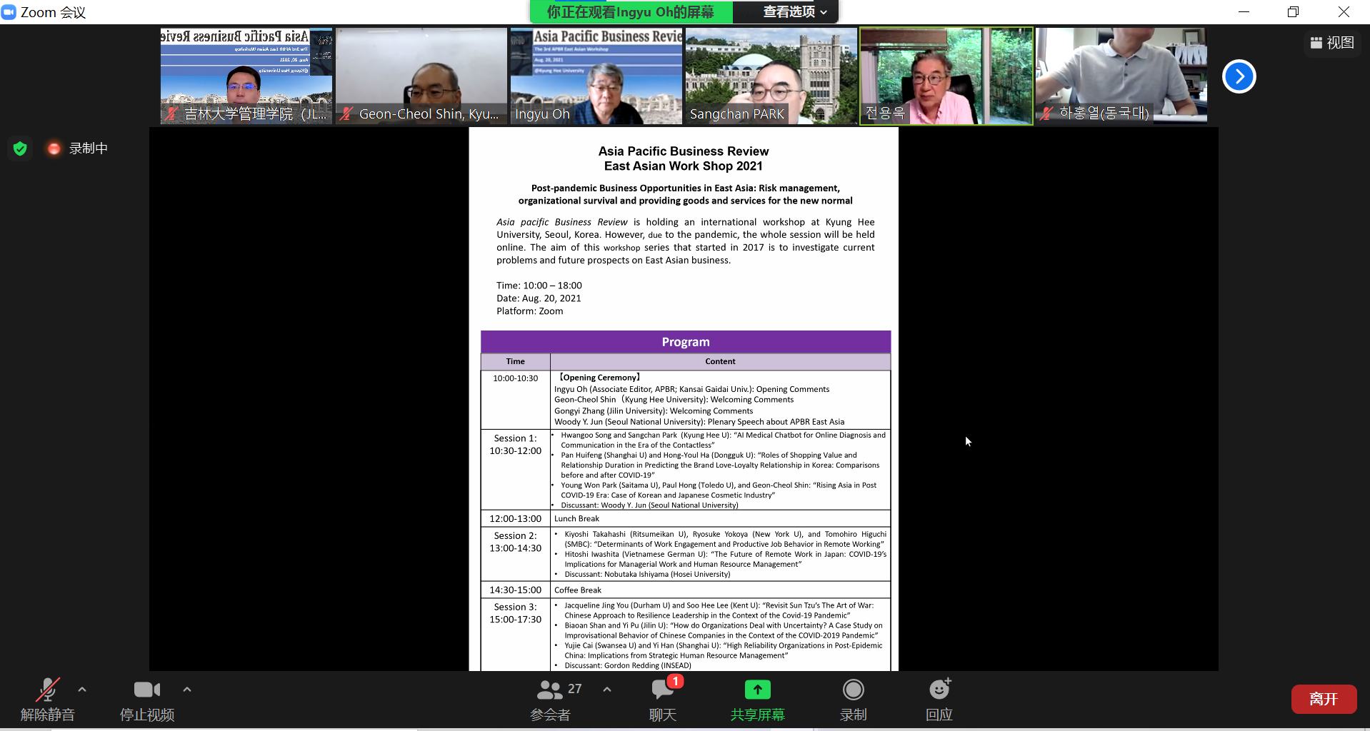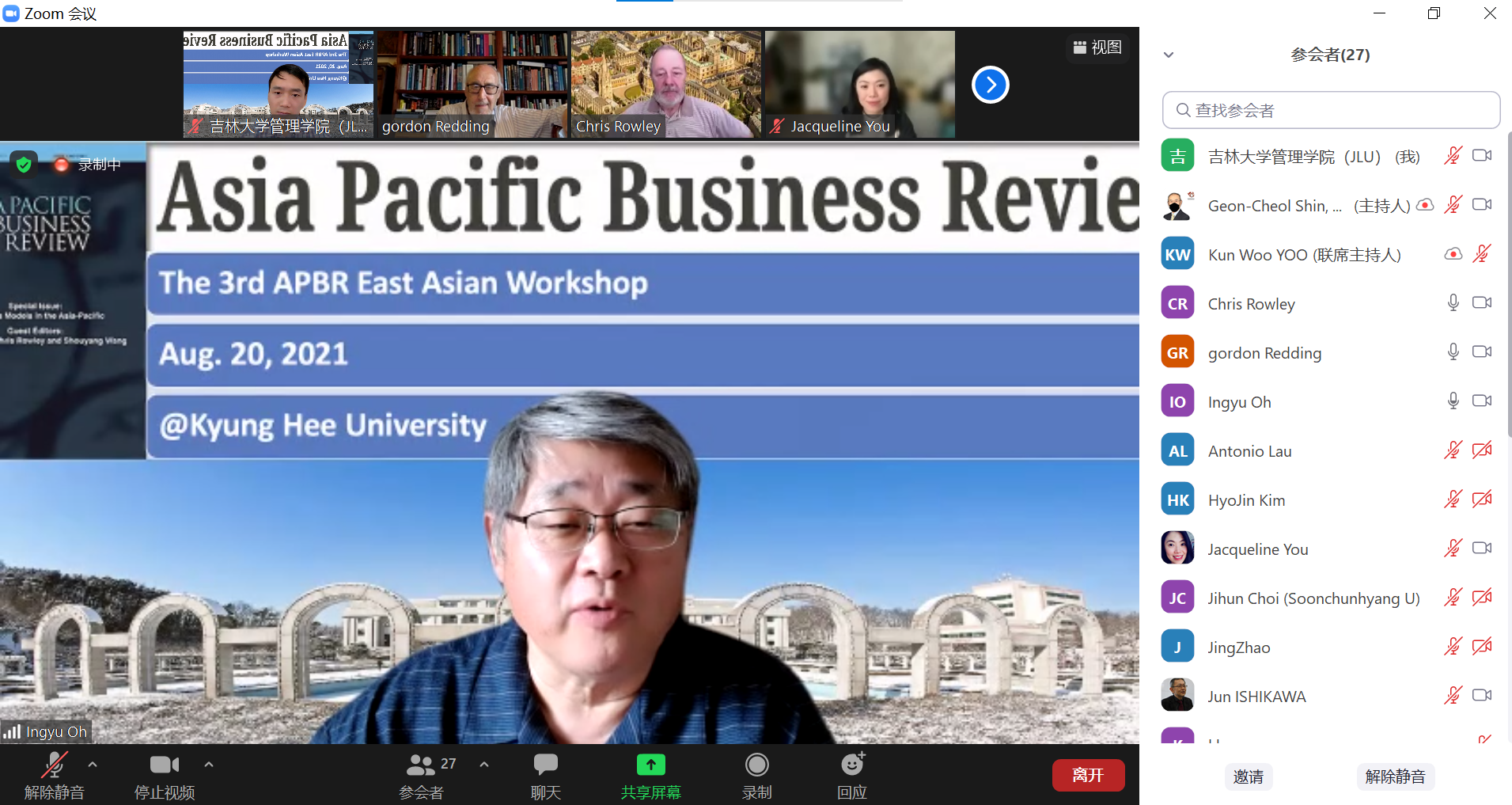 第三届“Asia Pacific Business Review(APBR)东亚地区会议”于2021年8月20日通过ZOOM平台以“云端”形式召开,本届会议由《亚太商学》英国国际期刊(APBR)主办,韩国首尔庆熙大学承办。该会议以“东亚疫情后的商机”为主题,旨在探讨包含“风险管理、组织生存以及为新常态提供商品和服务”在内的东亚企业当下面临的问题与挑战以及未来的发展方向及机遇。来自中国、英国、日本、韩国、印度等国家的17名代表参加会议。公司副经理张公一、副教授单标安及一名研究生代表应邀参加会议。