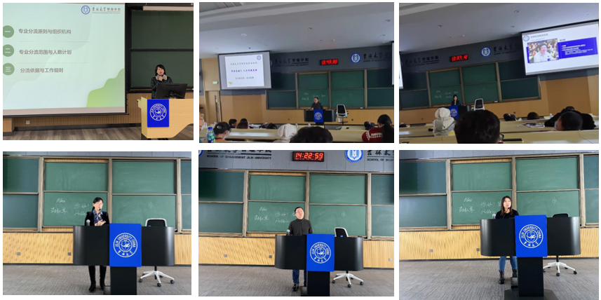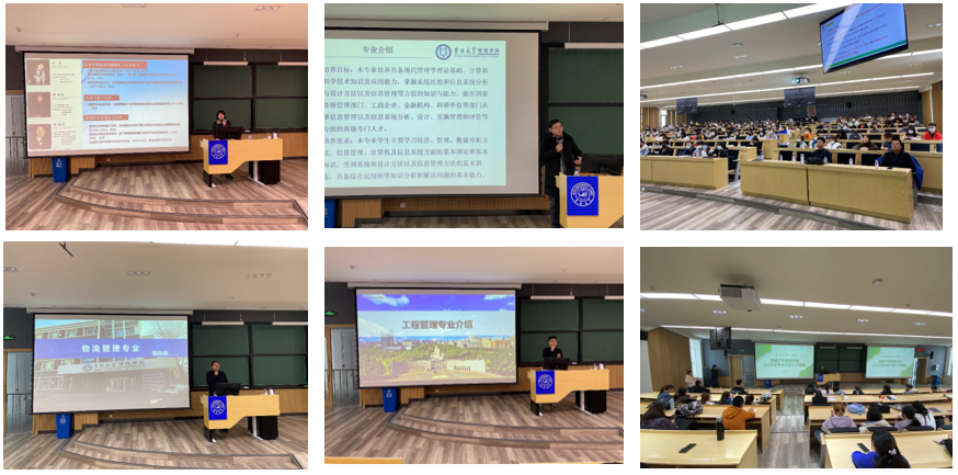 11月10日下午,管理公司2020级本科生专业分流宣讲大会在南岭校区逸夫楼511教室和516教室同时进行。管理公司教学副经理马捷向同学们解读了《管理公司2020级员工专业方向分流工作实施细则》,强调了分流工作尊重意愿与成绩择优相结合、公平公正与公开透明相结合等工作原则。信息管理与信息系统、大数据管理与应用专业的马捷、于宝君老师、物流管理专业的姚舜老师、工程管理专业的王东老师、工商管理专业的杨红、郭润萍老师、会计学专业的孟庆顺、满媛媛老师、市场营销和人力资源管理专业的古安伟老师进行了详细的专业介绍,两个会场近400名同学认真听取老师讲解,管理公司员工办公室、教务办公室的工作人员在宣讲现场为同学们服务。