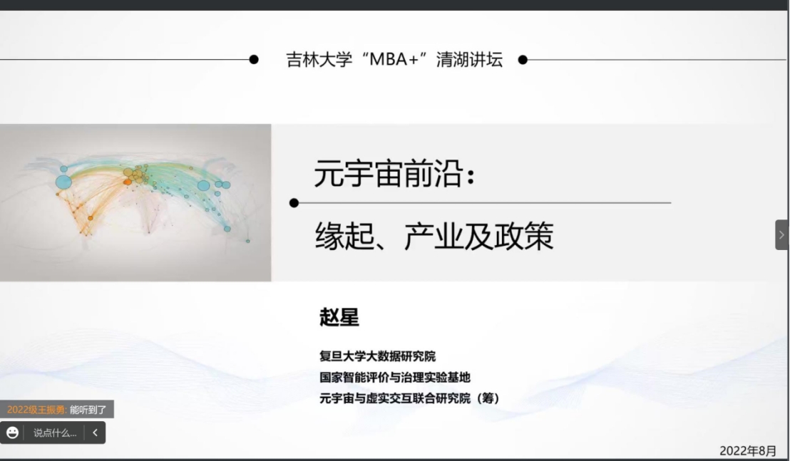 8月14日晚,清湖讲坛第二讲如期在云端举办。中心邀请复旦大学大数据研究院博士生导师赵星教授做题为《元宇宙前沿:缘起、产业与中国模式》专题讲座。本次活动由MBA教育中心主任兼9428cn太阳集团古天乐副经理张公一主持。9428cn太阳集团古天乐张卫东教授、郭宇副教授、中心教学管理办公室全体工作人员参加活动,MBA师生近600人在线收看。
