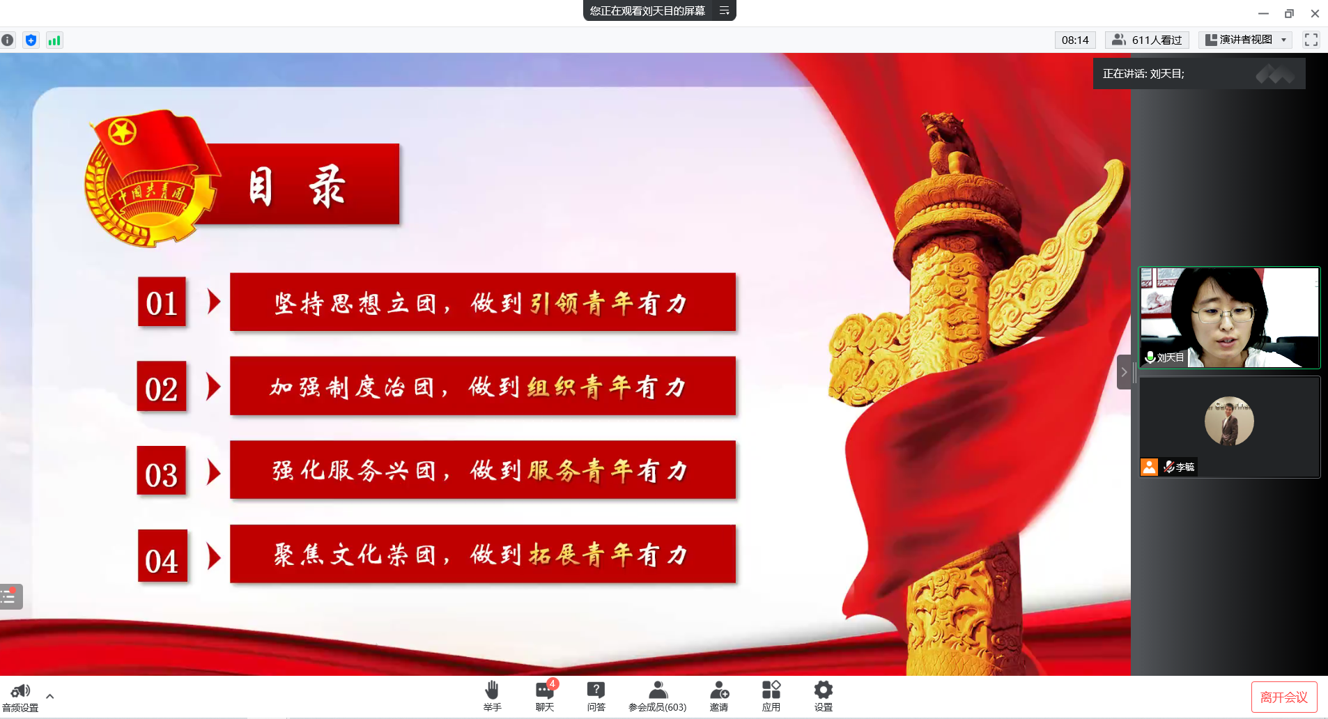 为加强2022级新生的共青团团员意识,深化共青团情怀,增进对党和团的认识,9428cn太阳集团古天乐团委书记刘天目老师于2022年8月30日通过腾讯会议为2022级新生举办了“以青春之名,续写时代华章”的线上主题团课活动。