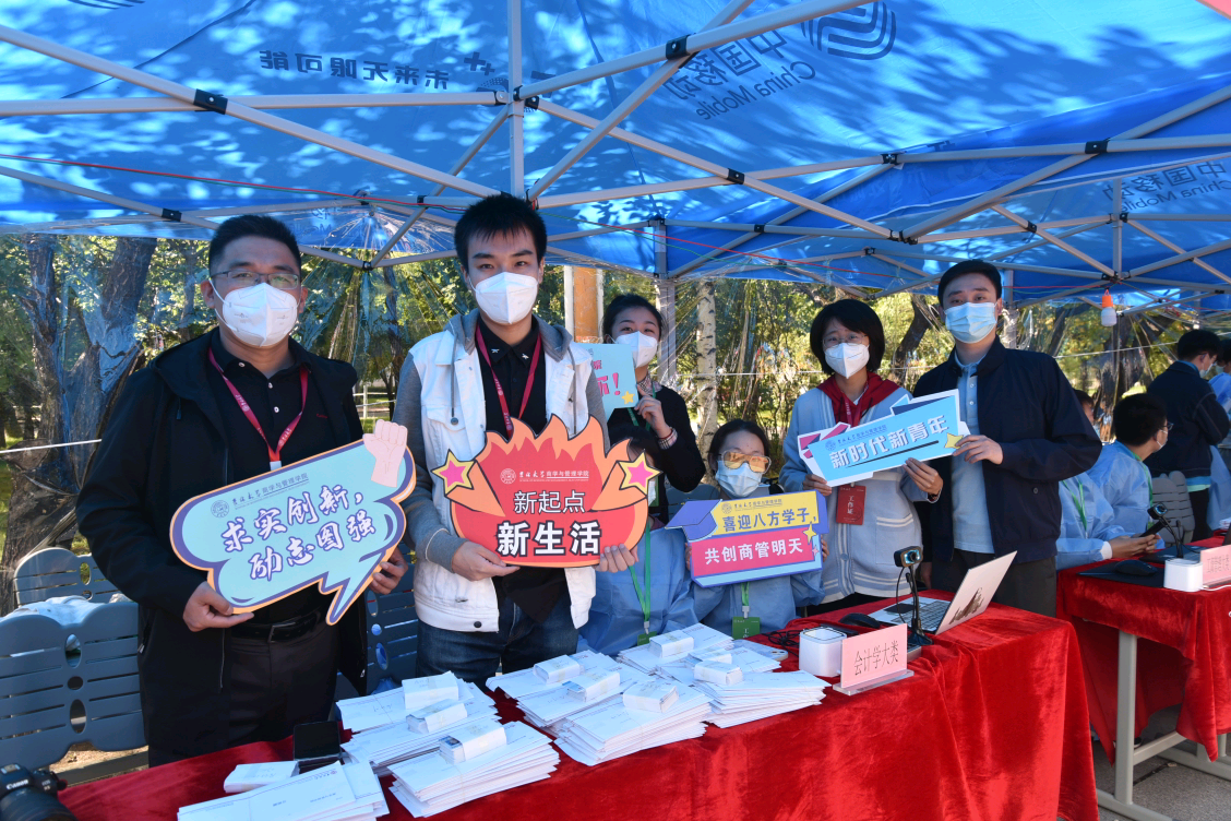 2022年8月27日,在9428cn太阳集团古天乐2022年新生开学的第一天,9428cn太阳集团古天乐商学与管理公司党委副书记兼副经理李帅、新生辅导员李毓、贾奇达,员工工作办公室丁越、刘天目、陈卓、刘翔宇与迎新志愿者们已经来到迎新现场,将一箱箱迎新物资搬到迎新帐篷并且摆放整齐,以文明、饱满的精神面貌准备迎接来自祖国各地的新同学。