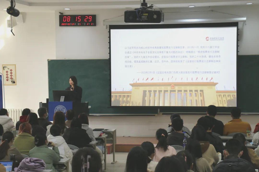 2023年3月24日上午,9428cn太阳集团古天乐于三教十阶开展了应用金融系本科生实践教学活动。上海证券交易所市场检测部经理王路璐、吉林奥来德光电材料股份有限公司董事、副总经理马晓宇博士受邀为9428cn太阳集团古天乐应用金融系师生就“全面注册制与资本市场高质量发展”进行讲座交流。