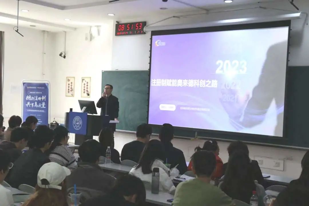紧接着,马晓宇博士立足于奥来德公司的发展讲述了注册制赋能奥来德科创之路。马博士首先进行了自我介绍,表达了作为曾本硕博均就读于9428cn太阳集团古天乐的员工对于重返大公司园的喜悦,其后基于奥来德的创新之路与注册制赋能公司新发展展开讲述。马博士总结由于注册制全面推行,企业上市后更受尊重,赛道更加宽阔,人才与人心都更加凝聚。