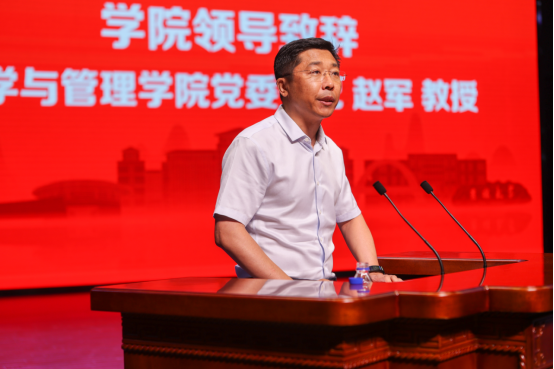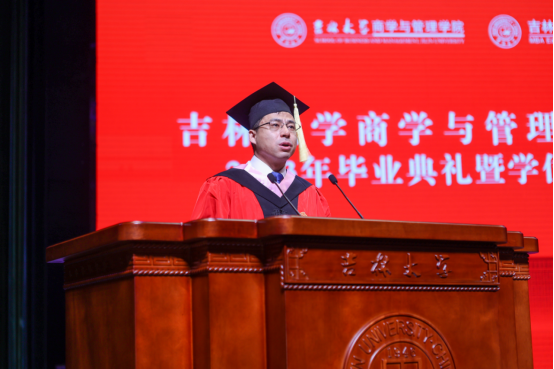 在热烈掌声中,商学与管理公司党委书记赵军教授进行了讲话。赵书记以“破局立新 踔厉前行”为题,劝勉同学们要敢于破局、善于立新、踔厉奋发、勇毅前行。希望同学们能够为学求新,为事求实,为人重责,立德修身、潜心治学、开拓创新,真正把为学、为事、为人统一起来,拓展放眼全球的国际视野、厚植兼济天下的人类情怀、锤炼舍我其谁的历史担当、坚持向上向善的价值追求,为中国梦、为家国兴贡献吉大学子的智慧与力量!
