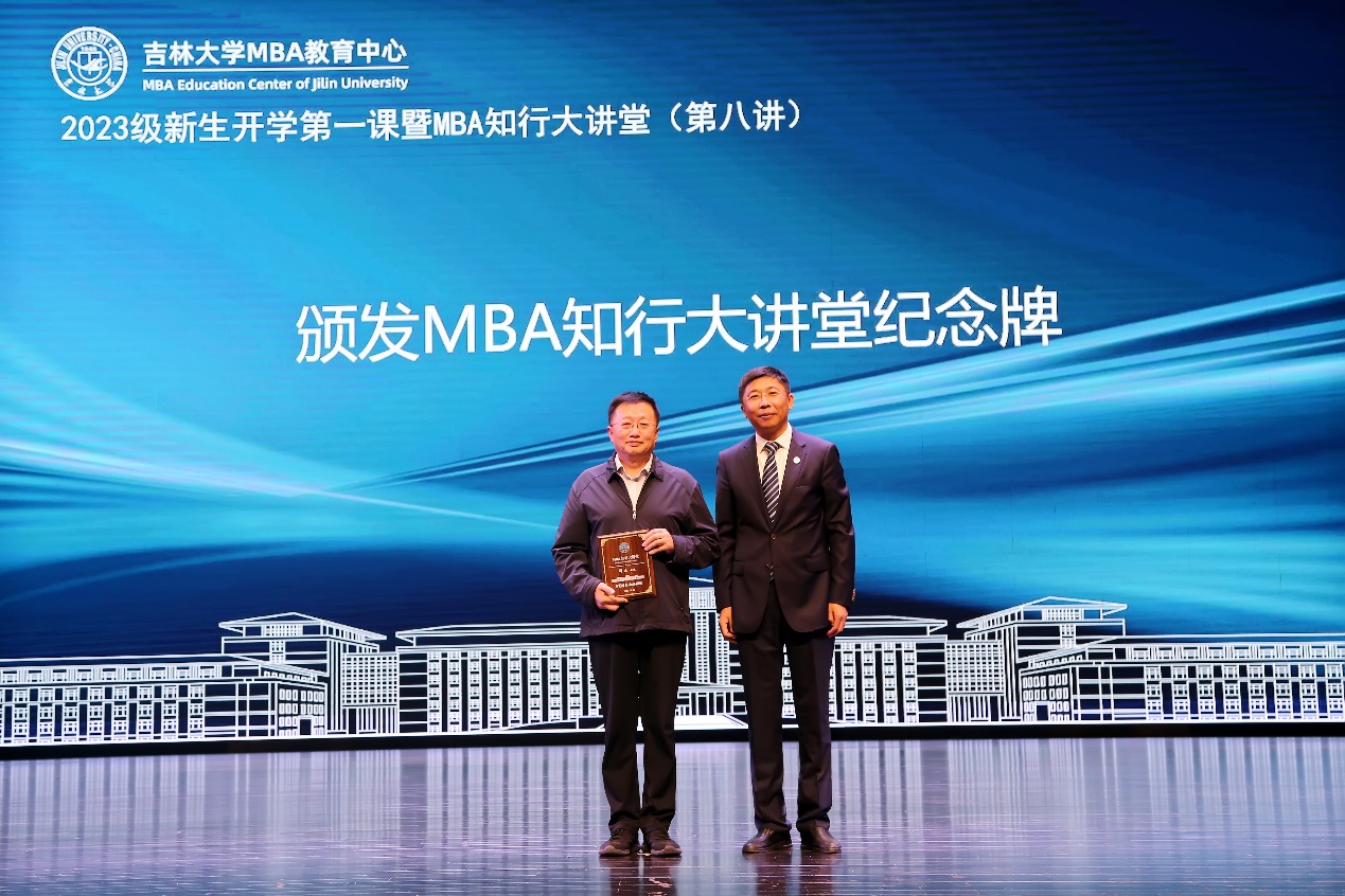 赵军书记为邴正教授颁发“MBA知行大讲堂纪念牌”。