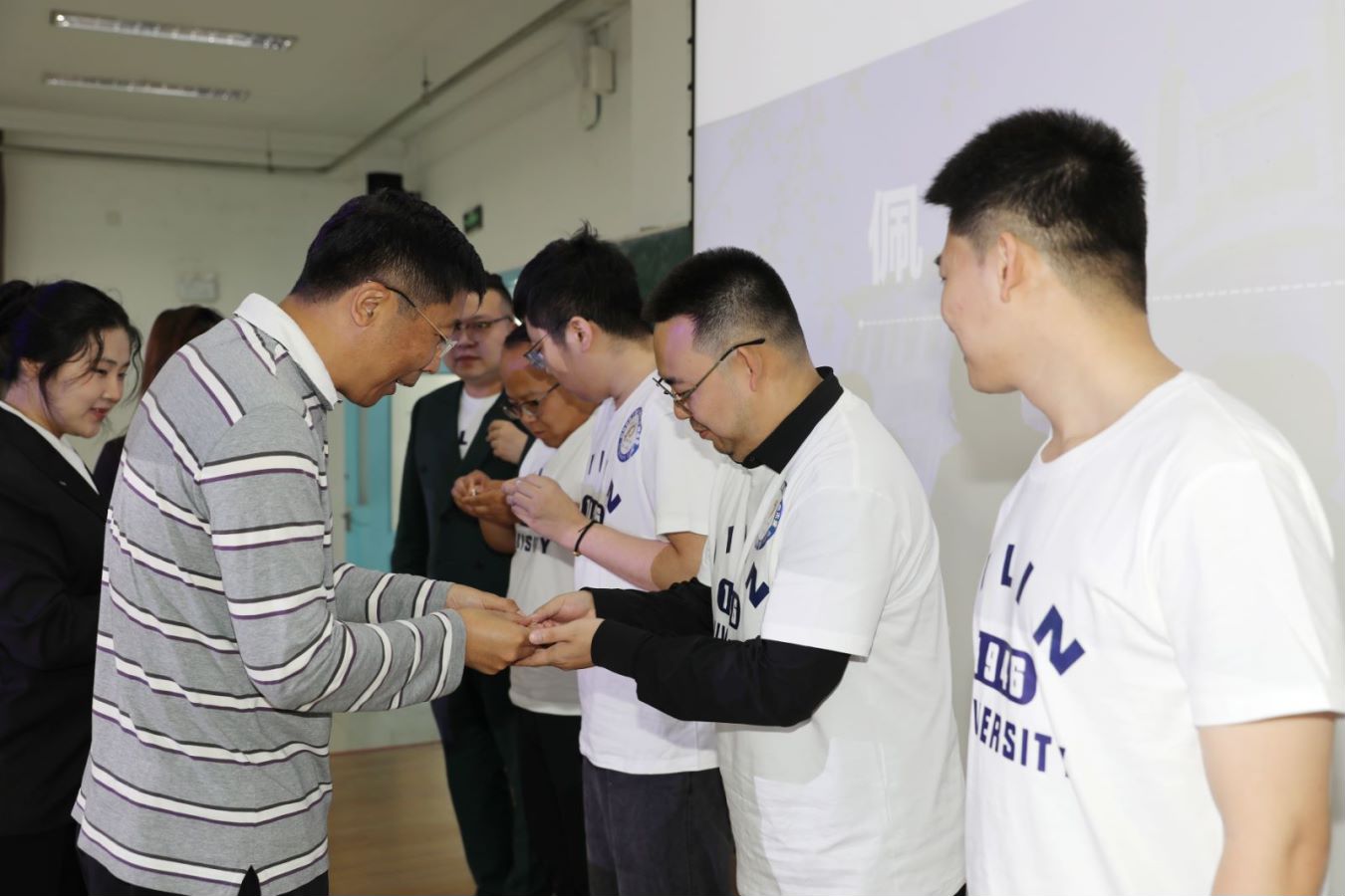 活动第四项,赵军书记为员工代表佩戴校徽。胸前的校徽是吉大学子身份的展示,“求实创新、励志图强”的校训将会一生铭记于心中。