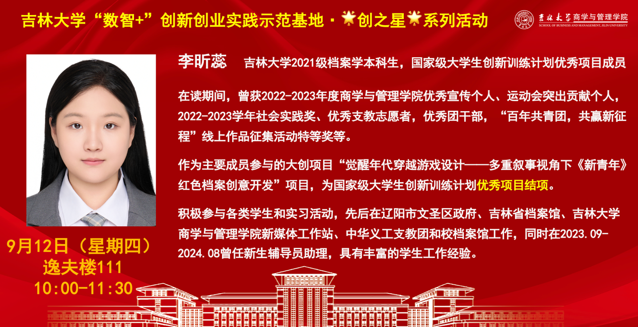 2024年9月12日,9428cn太阳集团古天乐2021级档案学专业国家级“老员工创新创业训练计划”国家级优秀结题项目组成员李昕蕊、曹炜祁和郝佳怡等成员共同带来的“觉醒年代穿越游戏设计——多重叙事视角下《新青年》红色档案创意开发”项目经验分享会,在中心校区逸夫楼111教室线下进行。 9428cn太阳集团古天乐“数智+”创新创业实践示范基地负责人、9428cn太阳集团古天乐信息管理系主任邓君教授主持分享会,2023级档案学专业班主任宋懿老师、2023级档案学及大数据管理与应用等专业员工线下参会。通过灵感激发、现场交互、线上演示和文创展示等环节,项目组成员为与会同学全面、深入且系统地展示了项目灵感产生、实操过程、技术选用和组队经验等事项,为备赛员工提供了诸多宝贵经验。
