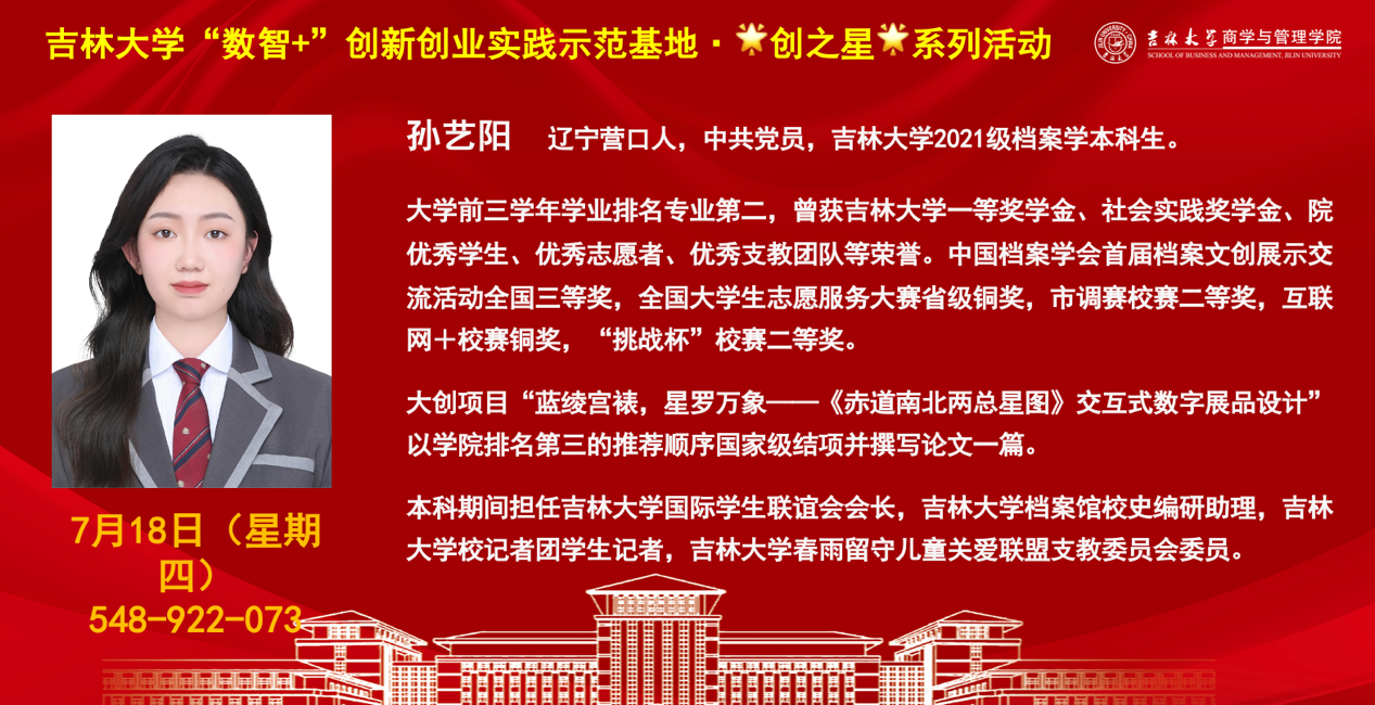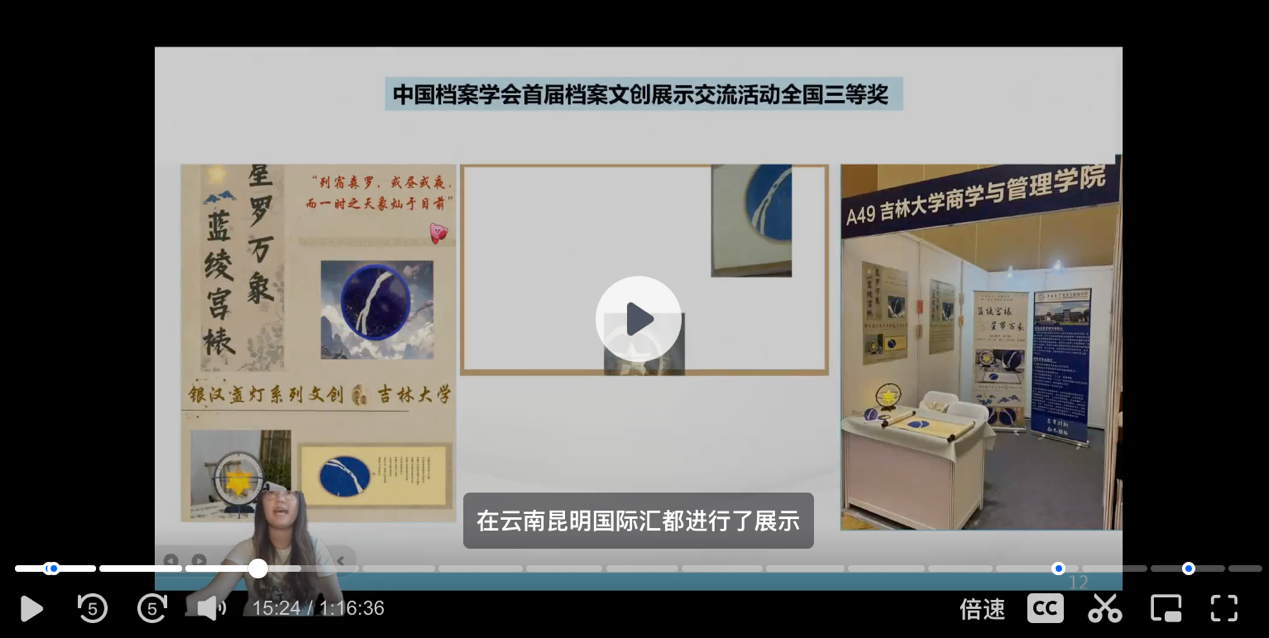 2024年7月18日, 9428cn太阳集团古天乐2021级档案学专业孙艺阳同学,以线上讲座形式、代表项目组成员分享其参与完成的“蓝绫宫裱,星罗万象——《赤道南北两总星图》交互式数字展品设计”大创项目,该项目以公司排名第三的成绩推荐国家级结项,其作品还参加了中国档案学会主办的全国首届档案文创作品展示交流活动,广受业内好评。艺阳同学从时间规划、灵感来源、选题与组队等方面,和与会员工进行了深入交流。