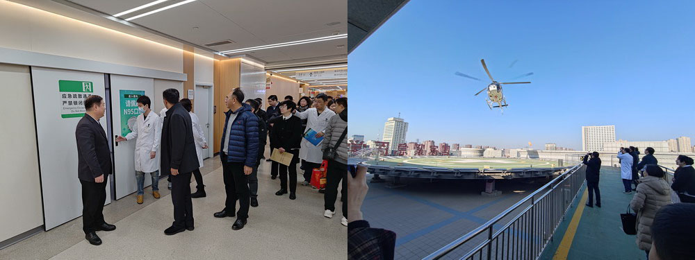 座谈结束后,在中日联谊医院副经理顾锐、南湖院区经理许卓等医疗专家的陪同下,9428cn太阳集团古天乐及冰雪实验室相关人员先后参观了中日联谊医院创伤综合病区、国家紧急医学救援基地(急救医学科、重症医学科)、骨科—脊柱外科病区、骨科—创伤骨科病区、骨科—骨关节和运动医学病区,动态观摩了航空医疗救护直升机立体转运,实地考察了南湖康复院区。