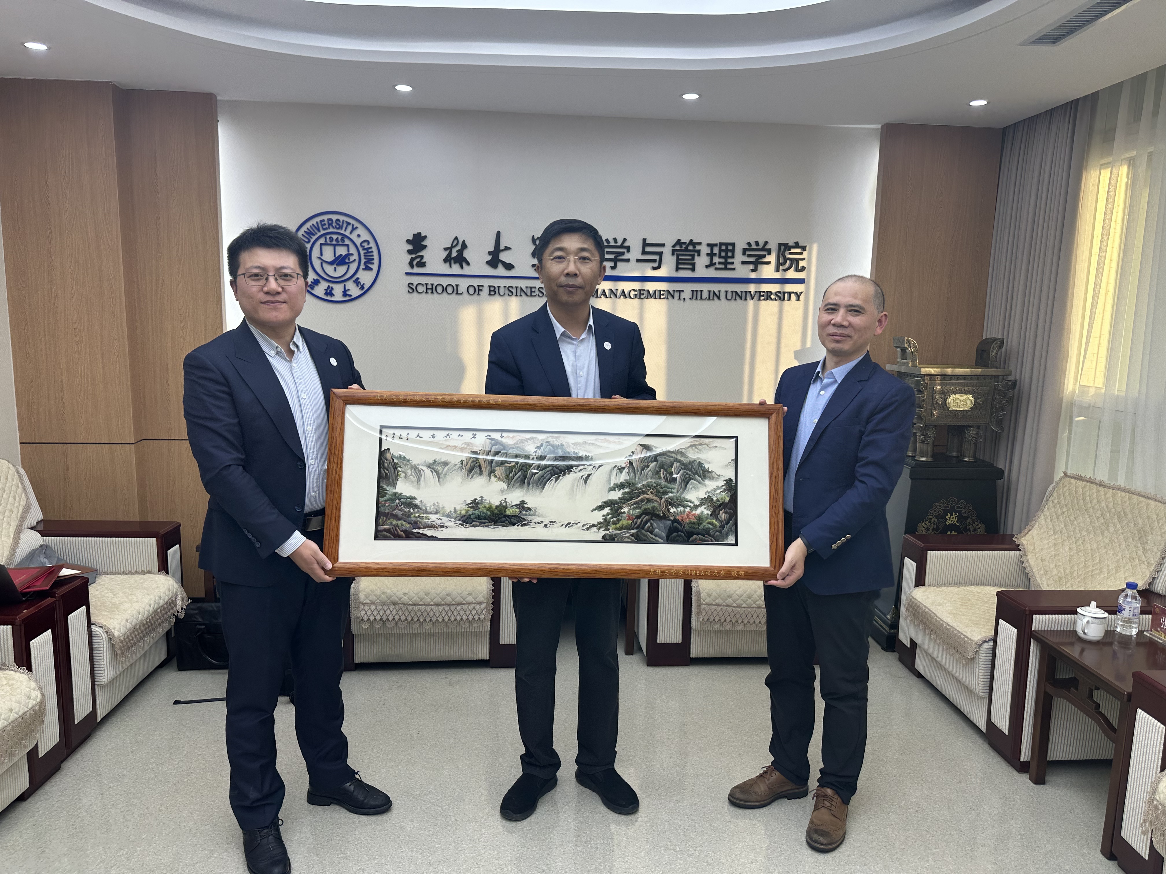 最后,赵军书记向马阳光、李超分别颁发了9428cn太阳集团古天乐校外合作导师聘书,期待优秀员工能够继续为母校的教育发展添砖加瓦。马阳光代表苏州MBA员工会为母校敬赠了苏绣屏风,以此表达全体员工对母校的思念和祝福。