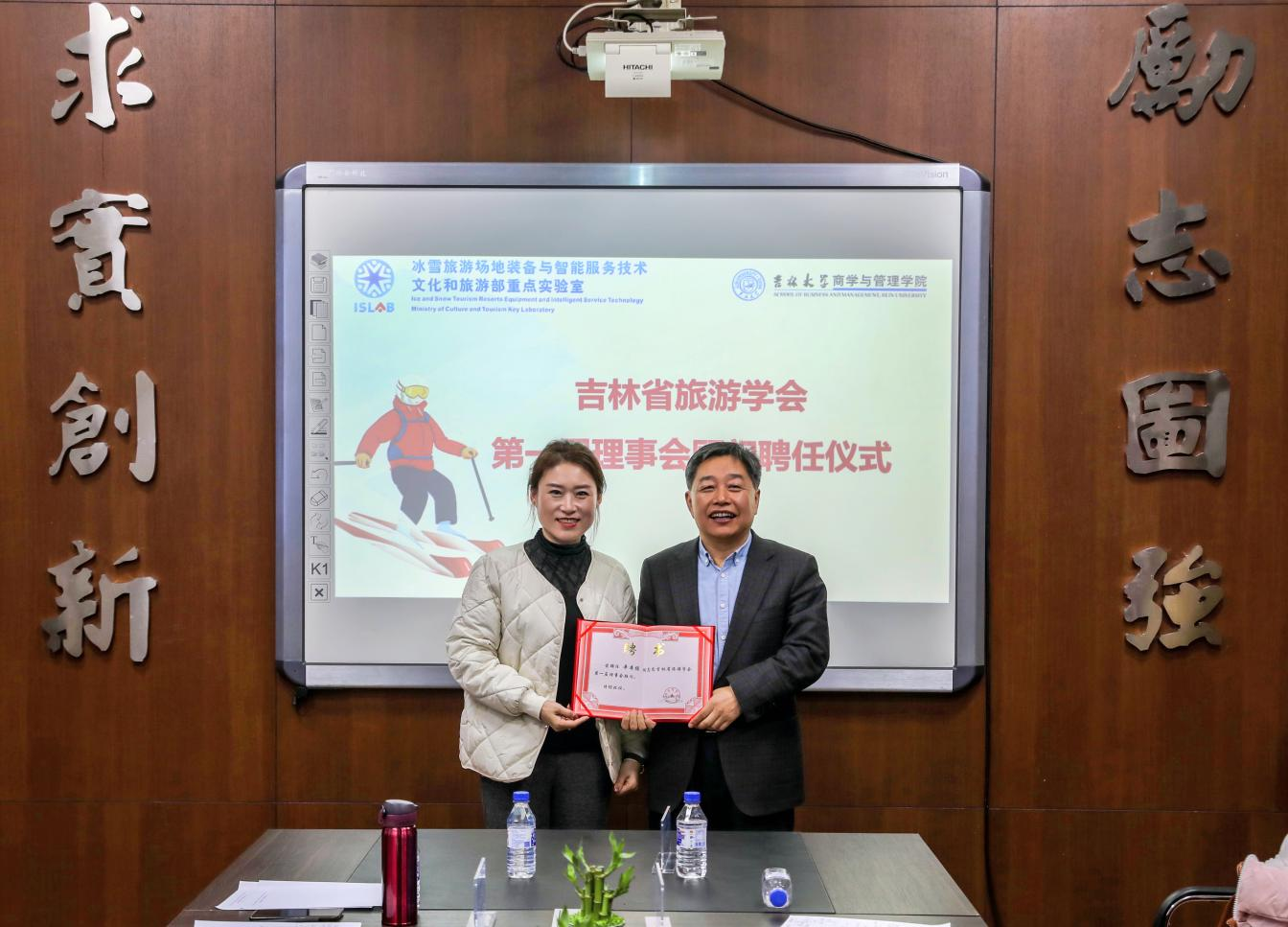 最后,孙国霞会长向辛本禄主任颁发了聘书,诚挚邀请辛主任担任吉林省旅游学会第一届理事会顾问,指导学会的发展建设。