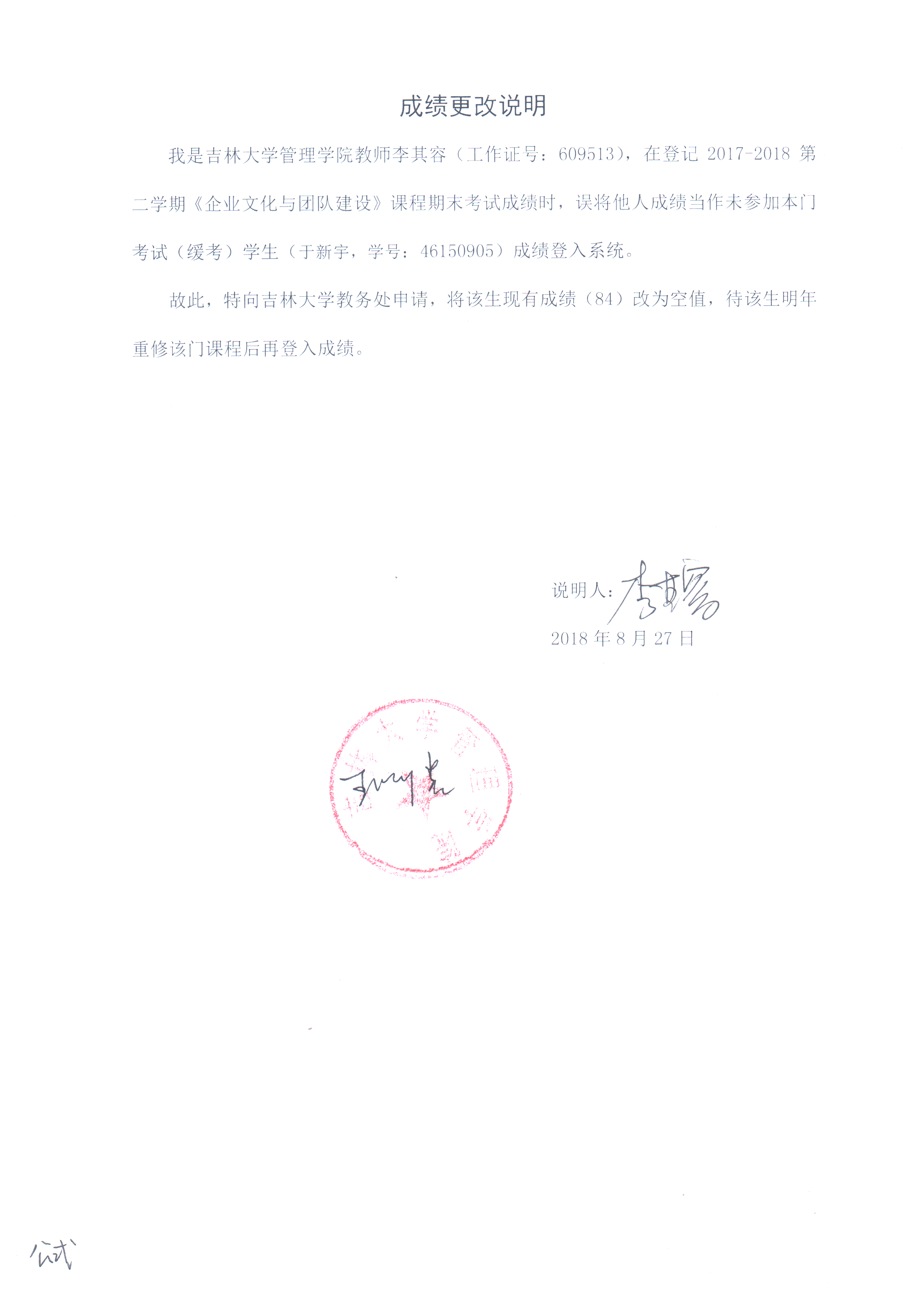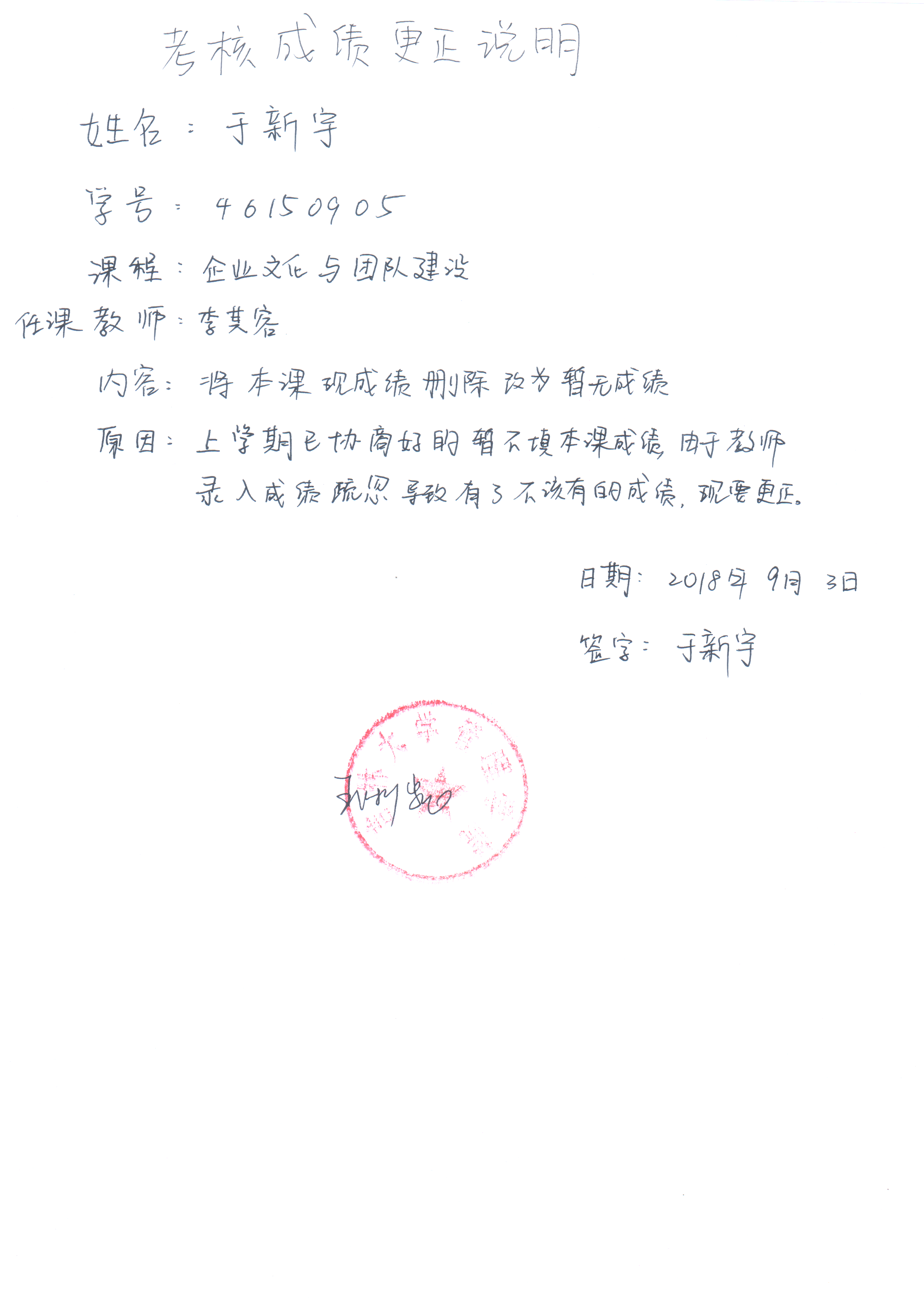 根据《关于进一步明确本科生课程考核等有关问题的通知》(校教字[2018]47号)文件有关精神,现对管理公司2015级于新宇同学(461509052017-2018-2《企业文化与团队建设(英)》成绩更正如下: