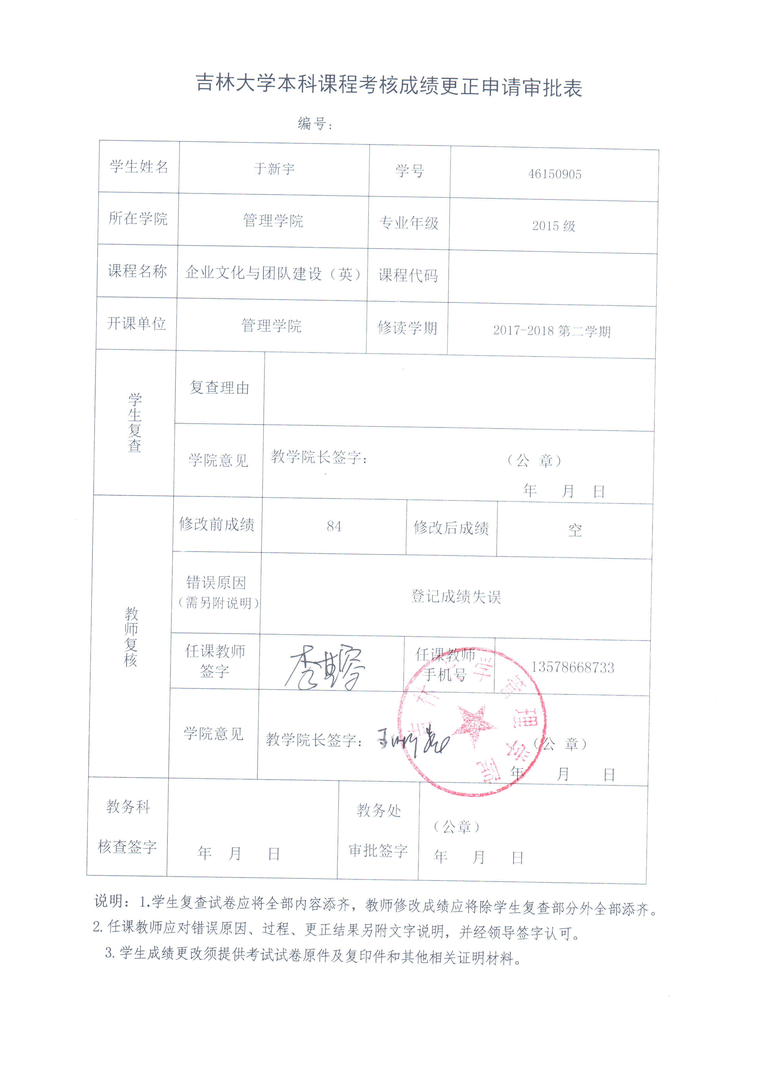 关于管理公司2015级于新宇同学《企业文化与团队建设(英)》成绩更正的公示