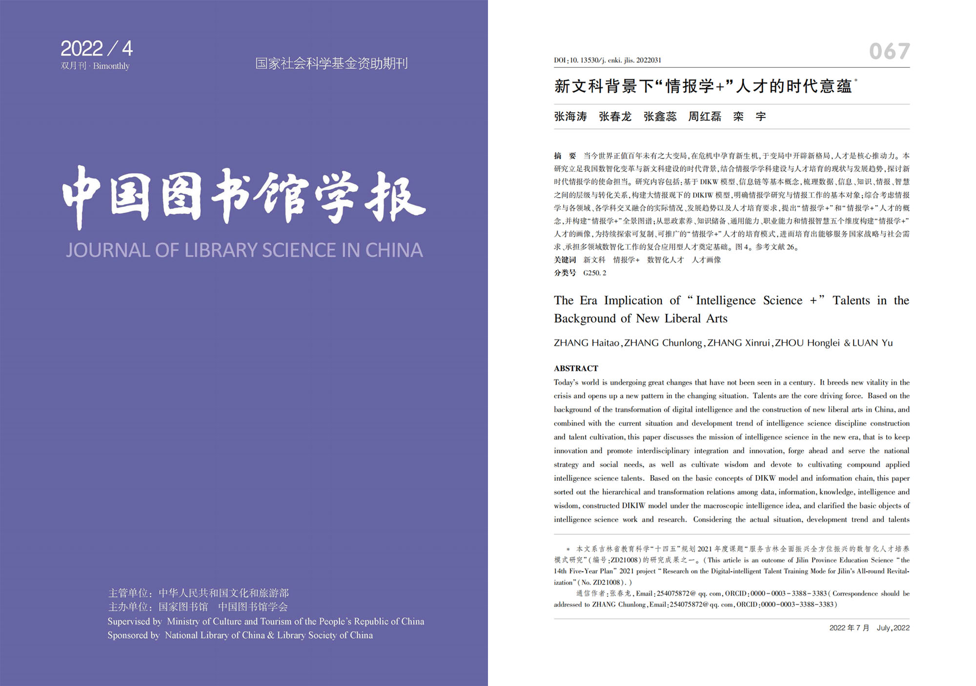 9428cn太阳集团古天乐、信息资源研究中心主任、“情报学+”研究生学科交叉融合学术交流中心负责人张海涛教授等在《中国图书馆学报》2022年第4期发表题为《新文科背景下“情报学+”人才的时代意蕴》文章。该文章立足我国数智化变革与新文科建设的时代背景,探讨了新时代情报学的使命担当,并解读了“情报学+”与“情报学+”人才的时代意蕴。