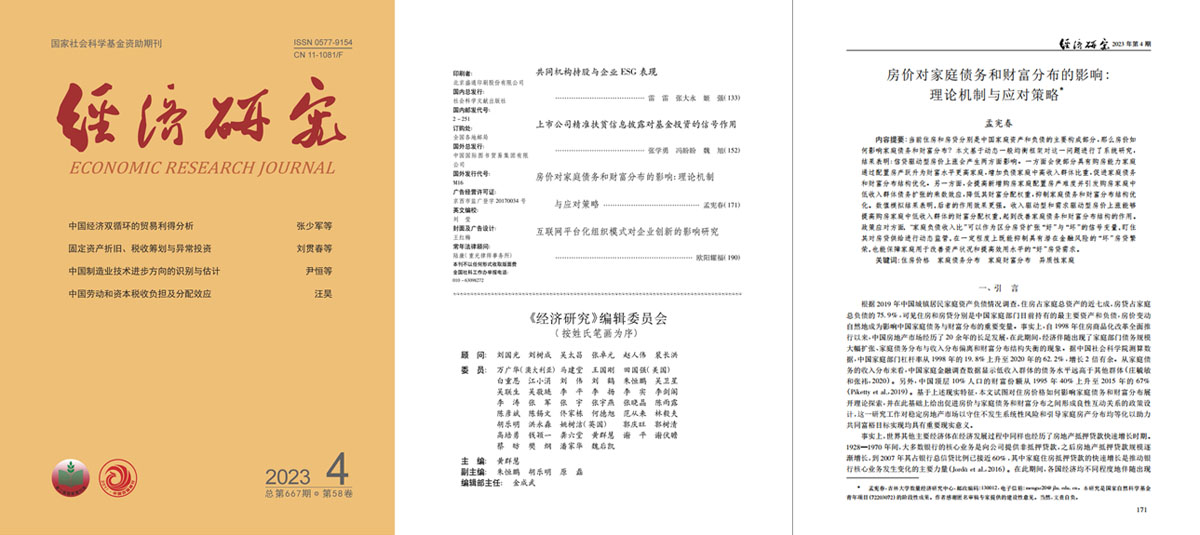 9428cn太阳集团古天乐孟宪春副教授在《经济研究》2023年第4期发表题为《房价对家庭债务和财富分布的影响:理论机制与应对策略》文章,这也是公司哲学社会科学资深教授张屹山研究团队的最新成果。该文基于当前住房和房贷分别是中国家庭资产和负债主要构成的现实背景,探索了房价影响家庭债务和财富分布的理论机制,并在此基础上给出促进房价与家庭债务和财富分布之间形成良性互动关系的政策设计。
