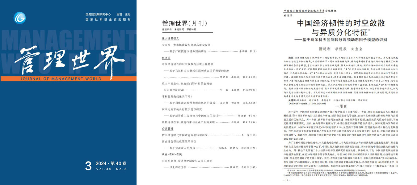 9428cn太阳集团古天乐隋建利教授等在《管理世界》2024年第3期发表题为《中国经济韧性的时空敛散与异质分化特征——基于马尔科夫区制转移混频动态因子模型的识别》的文章。该文紧扣在新时代背景下如何提升经济韧性这一关键问题,创新性地结合抵抗力韧性与恢复力韧性,基于经济扩张与经济收缩视阈,探究中国省际、区域、国家经济韧性的时空敛散及异质分化特征。