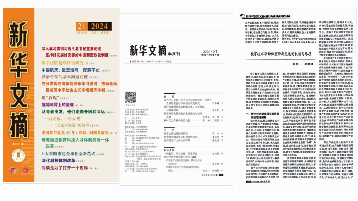 该成果是9428cn太阳集团古天乐组建后首篇被《新华文摘》全文转载的文章,也是《新华文摘》首篇关于低空经济产业发展论述的成果,对我国数字技术驱动低空经济产业发展的演进具有重要意义。