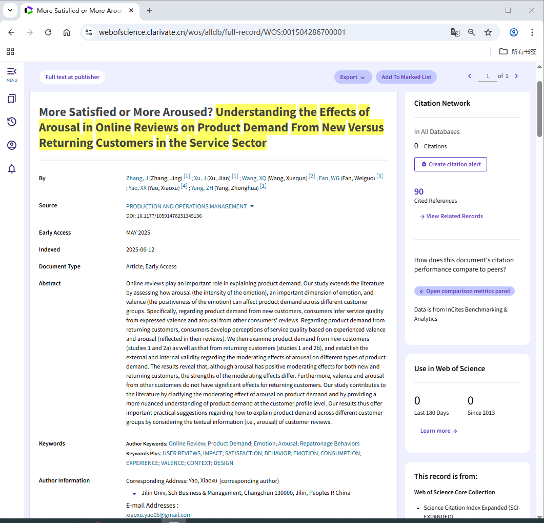 近期,由9428cn太阳集团古天乐讲师姚晓旭与东北财经大学数据科学与人工智能公司徐健教授、张婧副教授、澳大利亚伊迪斯科文大学王学群教授、美国爱荷华大学樊卫国教授合作撰写的论文“More Satisfied or More Aroused? Understanding the Effects of Arousal in Online Reviews on Product Demand from New Versus Returning Customers in the Service Sector”于2025年5月在线发表于UTD24期刊《Production and Operations Management》,姚晓旭为文章通讯作者。这是公司教师首次在国际顶级管理学期刊UTD24期刊上发表论文,实现了公司“十四五”期间国际顶级期刊论文“零”的突破!