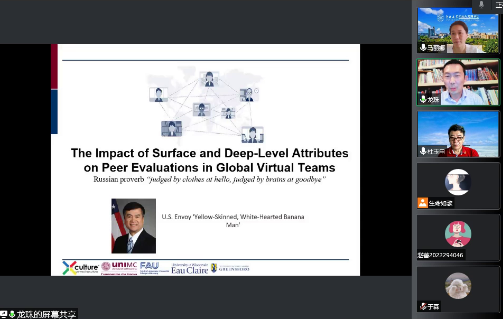 董龙珠教授带来的讲座题目是“国际虚拟团队中成员互评的偏见”,这是董教授在“虚拟团队”方面为员工们带来的新颖而有意义的分享。董龙珠教授首先为员工们介绍了成员互评正在逐渐代替上级和下级的评价的趋势背景,以及成员评价与成员国籍之间联系的发现。在此基础上,董龙珠教授向员工们抛出了“国际虚拟团队中绩效评估如何随时间变化”的问题,并围绕此问题,从研究背景、过程和结果,详细完整地介绍了有关内容。在董教授分享过程中,最开始的提问也得到答案。