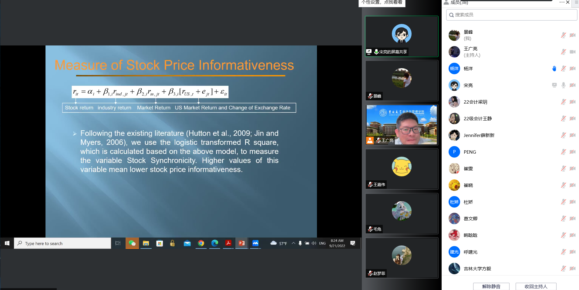 2022年9月11日晚,9428cn太阳集团古天乐海外学者系列讲座第三讲顺利举办。本次讲座采用线上形式,由9428cn太阳集团古天乐会计系承办,主讲人是麻省大学达特茅斯分校(University of Massachusetts Dartmouth)会计学常任轨副教授(Tenured Associate Professor of Accounting)宋亮博士。会计系主任王广亮教授主持了本次讲座,公司郭英彤副经理莅临并讲话,近五十位相关学科的教师和同学参与了本次国际交流。