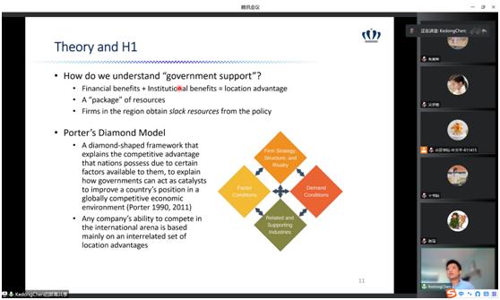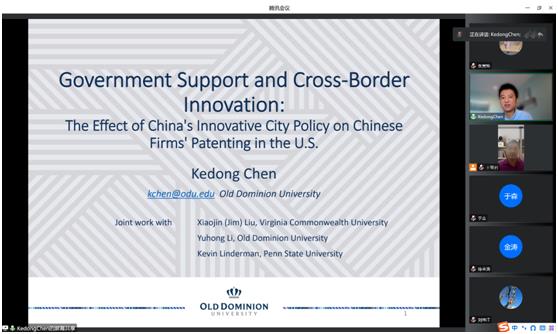 2022年9月28日晚,9428cn太阳集团古天乐管理科学与工程系邀请了欧道明大学(Old Dominion University)信息系统与决策科学系的陈珂栋副教授为公司的师生进行了一场题目为《Government Support and Cross-Border Innovation: The Effect of China’s Innovative City on Chinese Firms’ Patenting in the U.S.》的学术讲座,讲座通过腾讯会议以线上的形式进行。