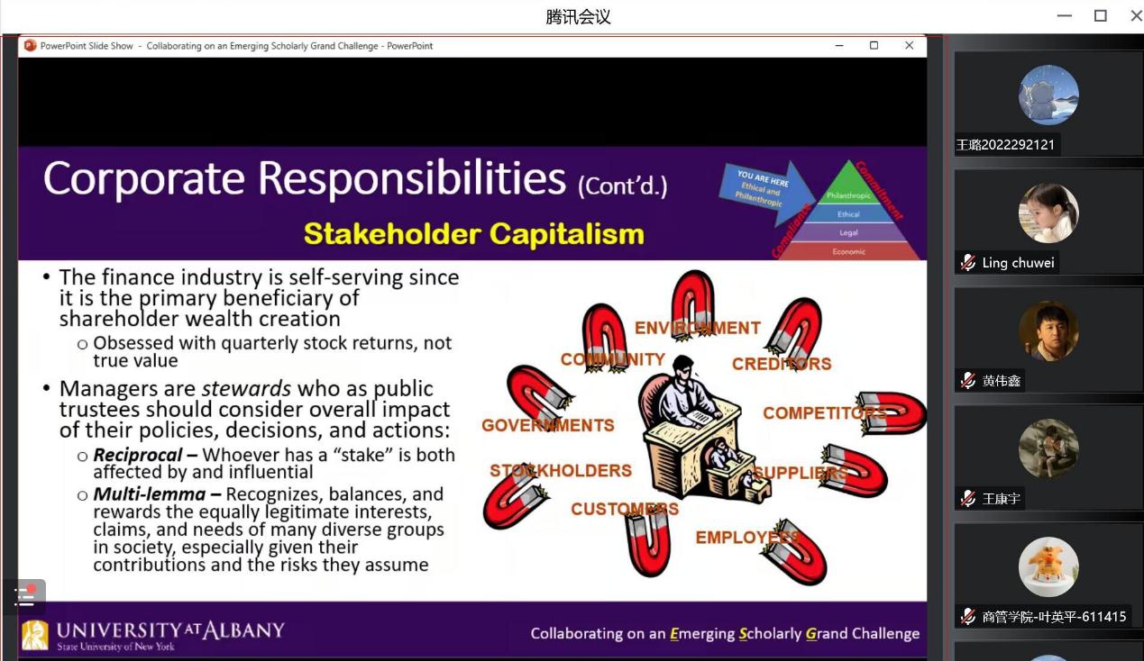 讲座过程中,Paul 教授与师生们进行在线互动,Paul教授发起了一项在线调查,以了解参会的同学们对ESG和企业责任的认识。随后Paul Miesing教授以Governance、Social、Environment的顺序为大家介绍了ESG,并介绍了代理理论,资源依赖理论,机构理论等相关的理论。