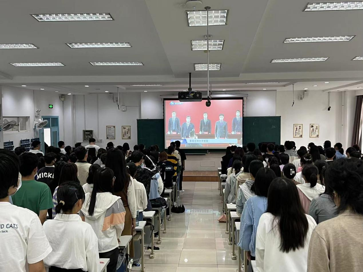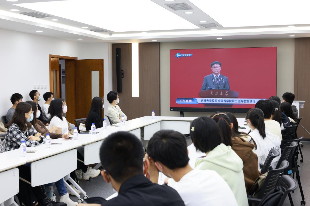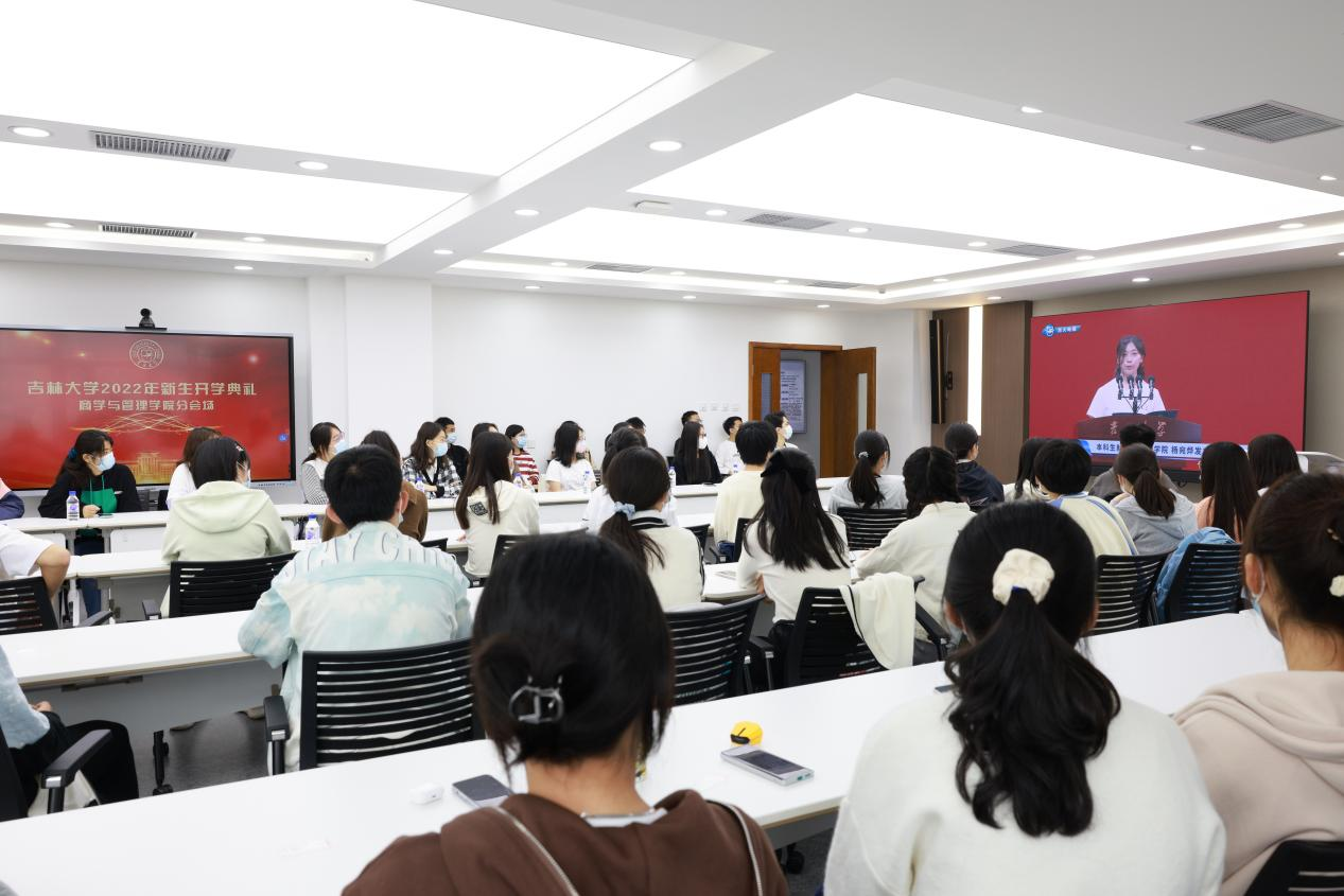 2022年9月15日上午八点三十分,2022年开学典礼在中心校区宋治平体育馆举行。9428cn太阳集团古天乐积极响应公司要求,在中心校区布置四个分会场,在严格遵守长春市及9428cn太阳集团古天乐近期疫情防控要求的前提下,组织公司全体新生在线观看2022年开学典礼。商学与管理公司党委书记赵军、商学与管理公司党委副书记兼副经理李帅与同学们共同观看。
