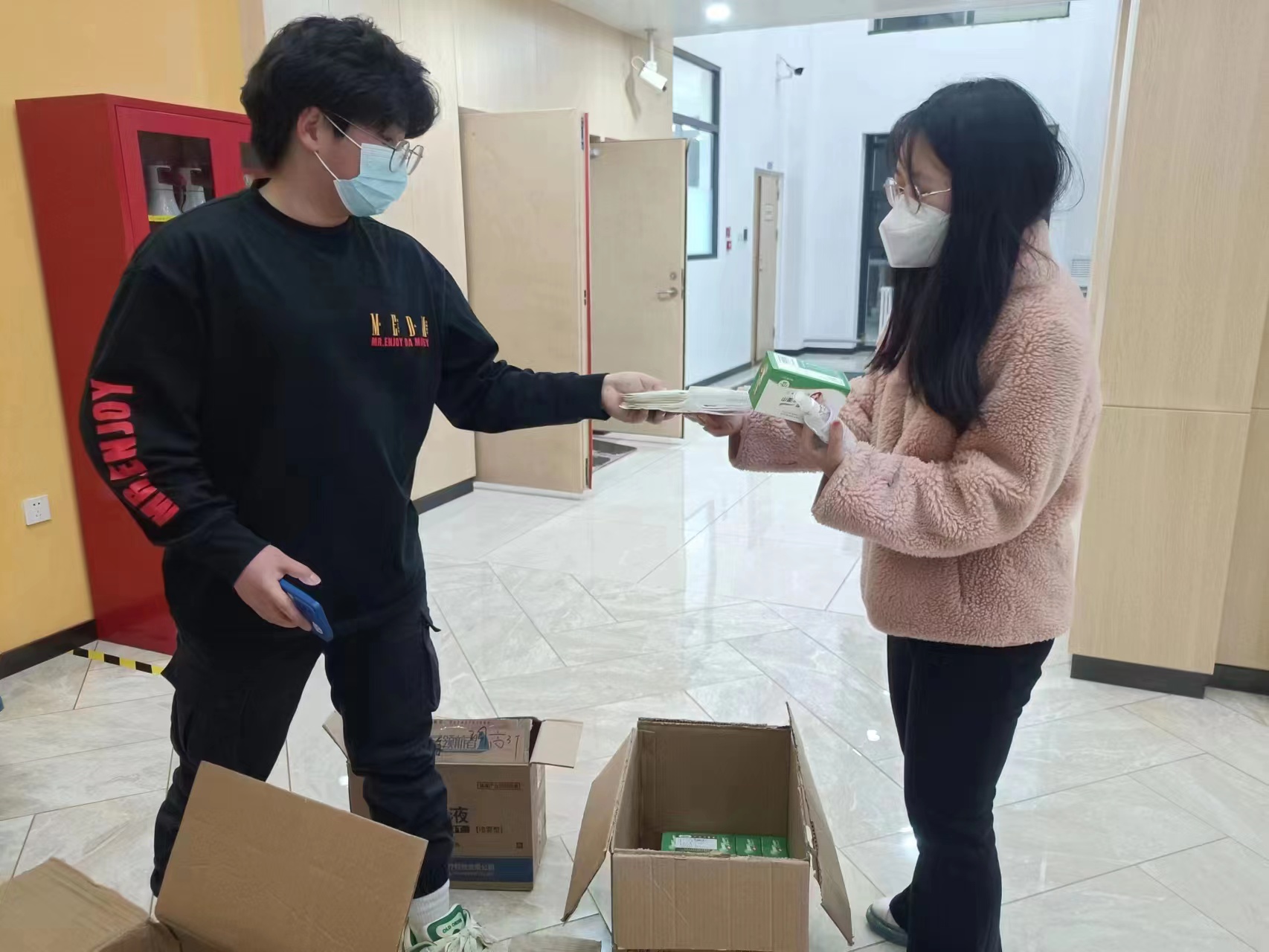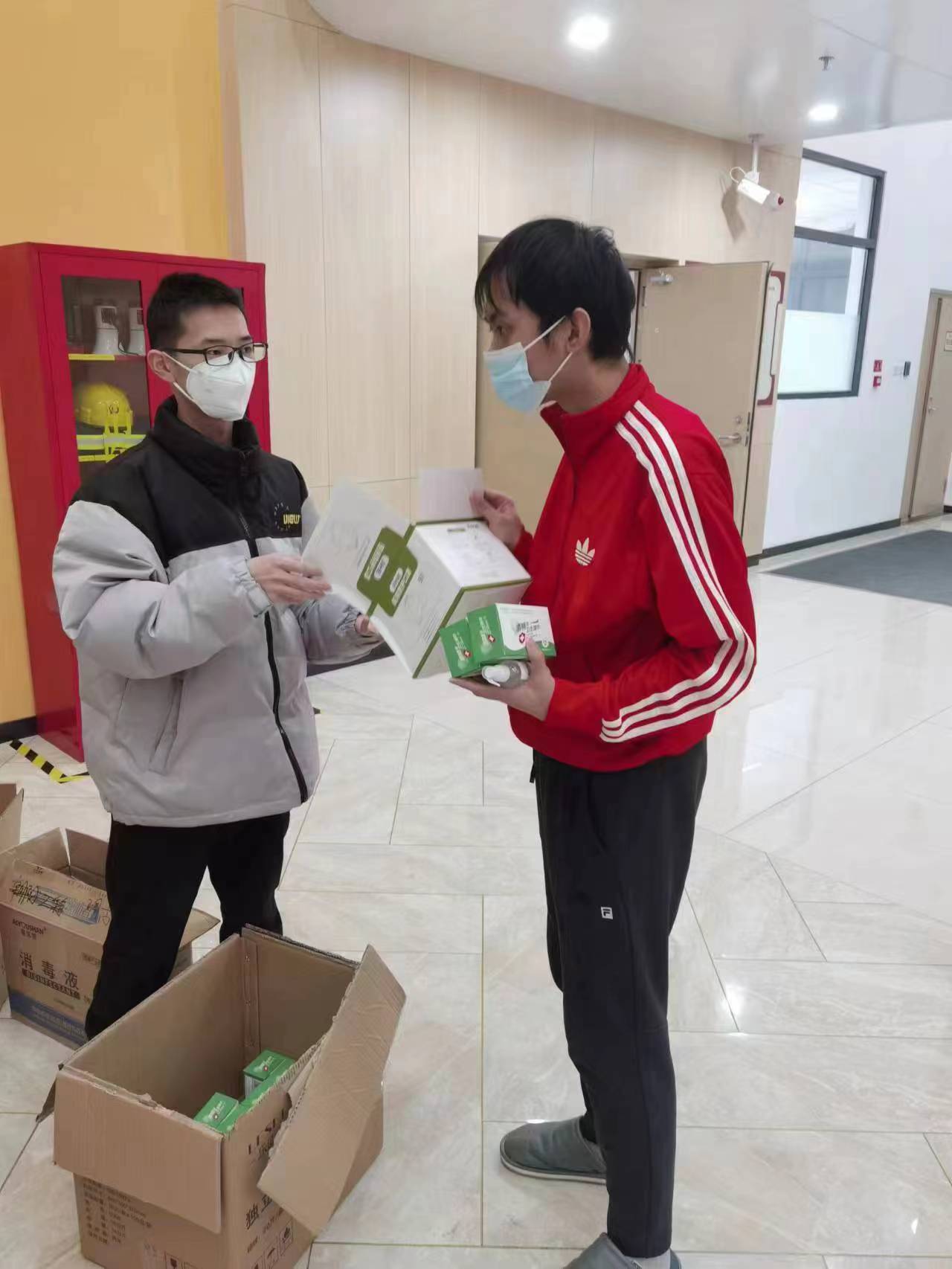 社会当前疫情形势严峻,在了解到社会外备物资稀缺、购买困难,而在校同学疫情环境不稳定的情况后,副董事长蔡立东、党委书记赵军等公司领导、老师在第一时间联系了社会各企业、医院及药店,积极沟通协调,购买口罩、消杀用品等疫情防控重点保障物资,极力保障在校员工的防疫物资需求。公司上下齐心协力、全力配合。经多方筹措,公司成功为在校员工筹措防疫物资,共筹集N95口罩4000余个、酒精喷雾800余瓶、消毒湿巾800余包。并逐一分发至各学子手中。