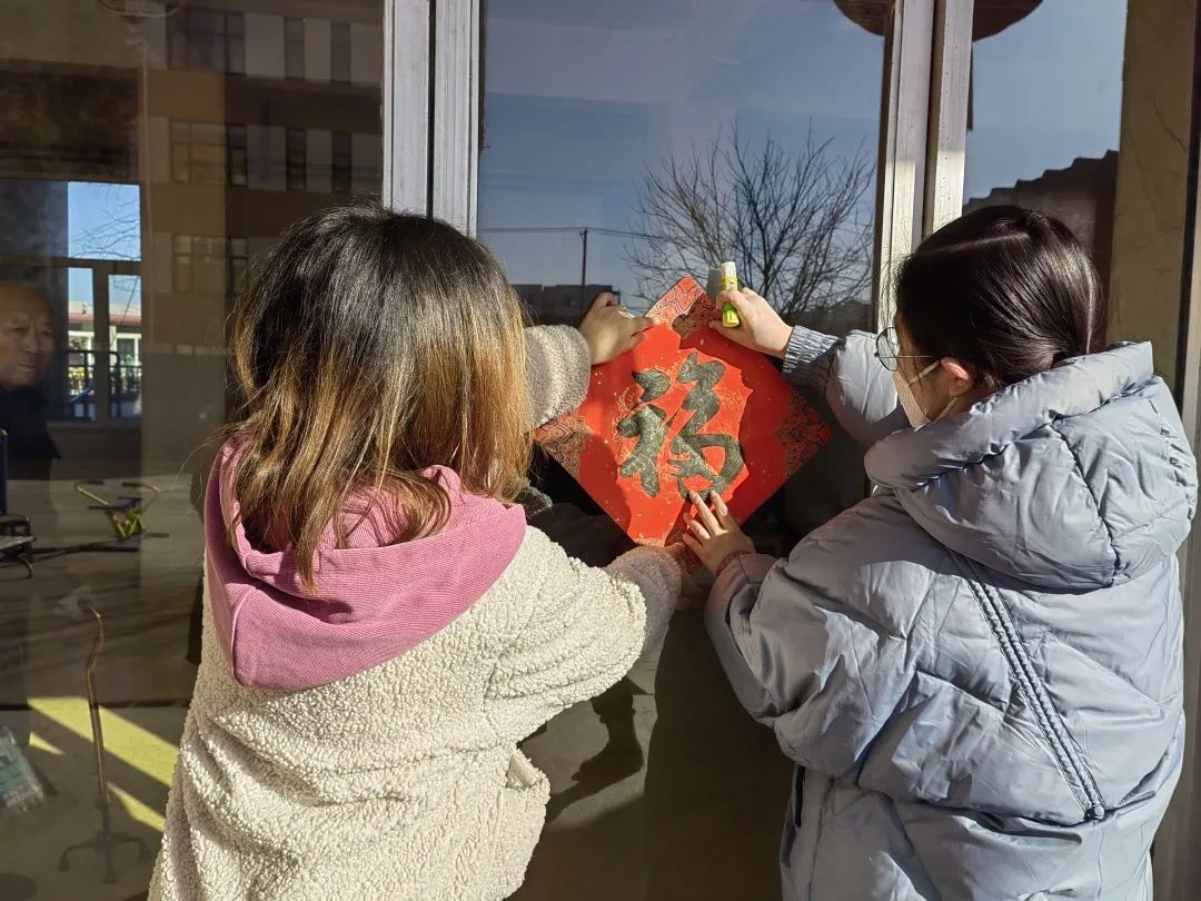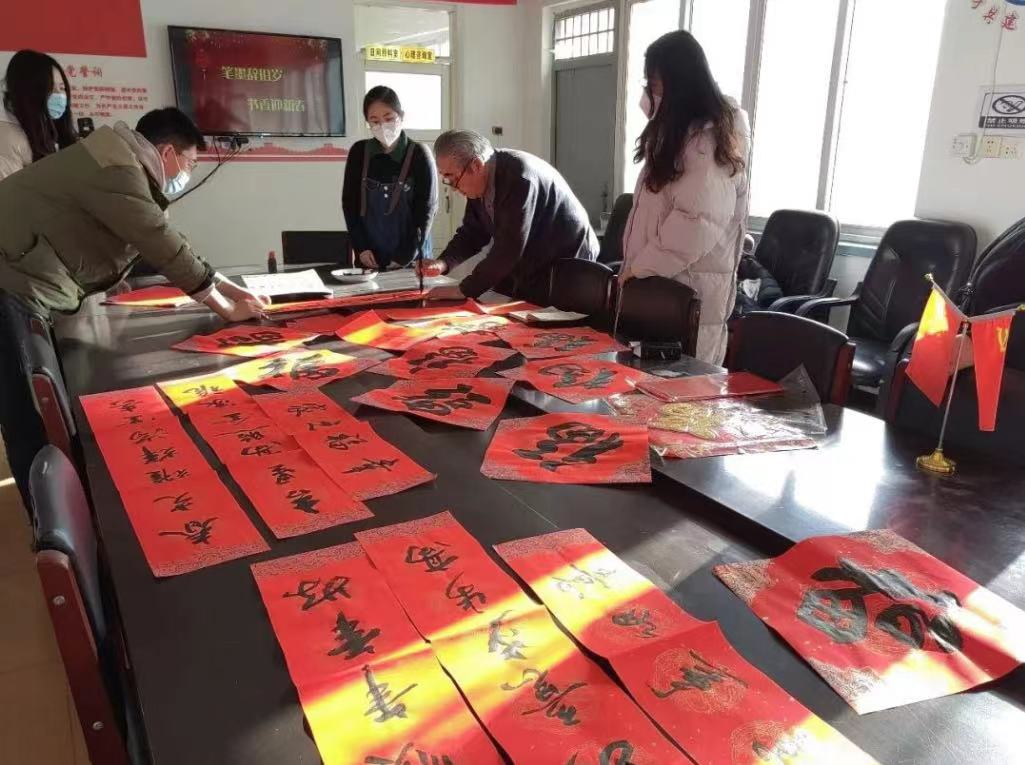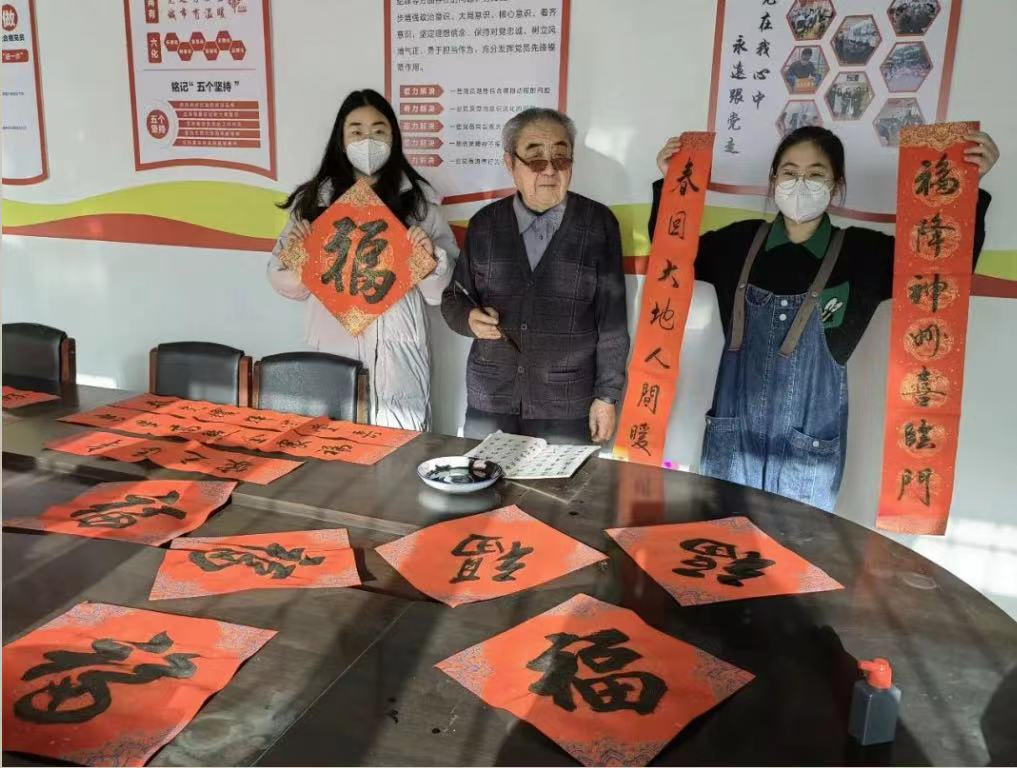 活动期间恰逢春节,为了更好地营造年味,团队成员特地在社区工作人员的协助下开展了“笔墨辞旧岁 书香迎新春”活动,邀请了年过七旬的老党员李爷爷为大家书写福字和春联。活动现场,李爷爷认真而专注地挥毫拨墨,大红的春联喜气洋洋,浓浓的年味浓缩于一笔一画之间,将新年祝福倾注于喜庆的春联纸上。团队成员把这些饱含祝福的春联和福字送到社区空巢老人的手中,和老人一起贴春联,与老人亲切交谈,详细了解老人的生活情况、困难和需求,叮嘱老人要注意身体,保持身心愉快,喜迎新春佳节。