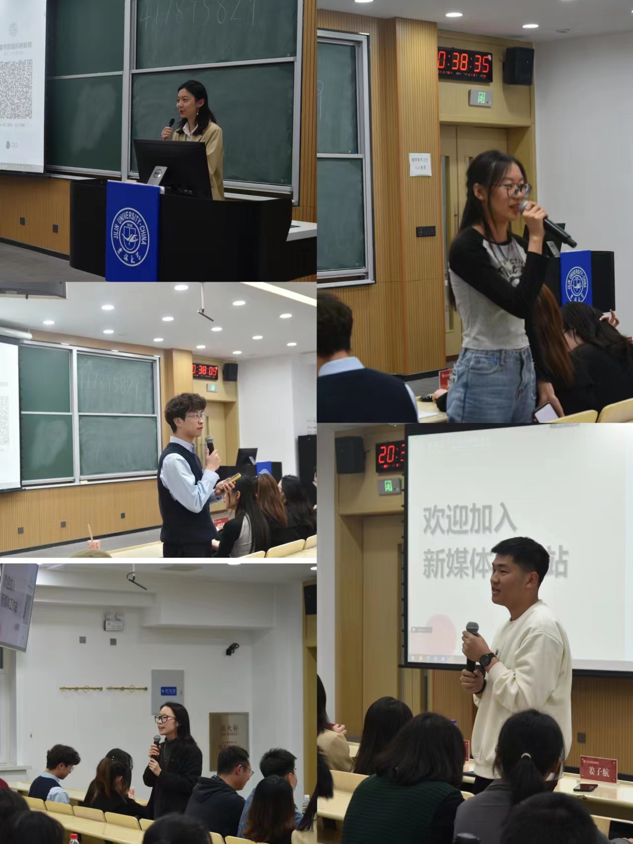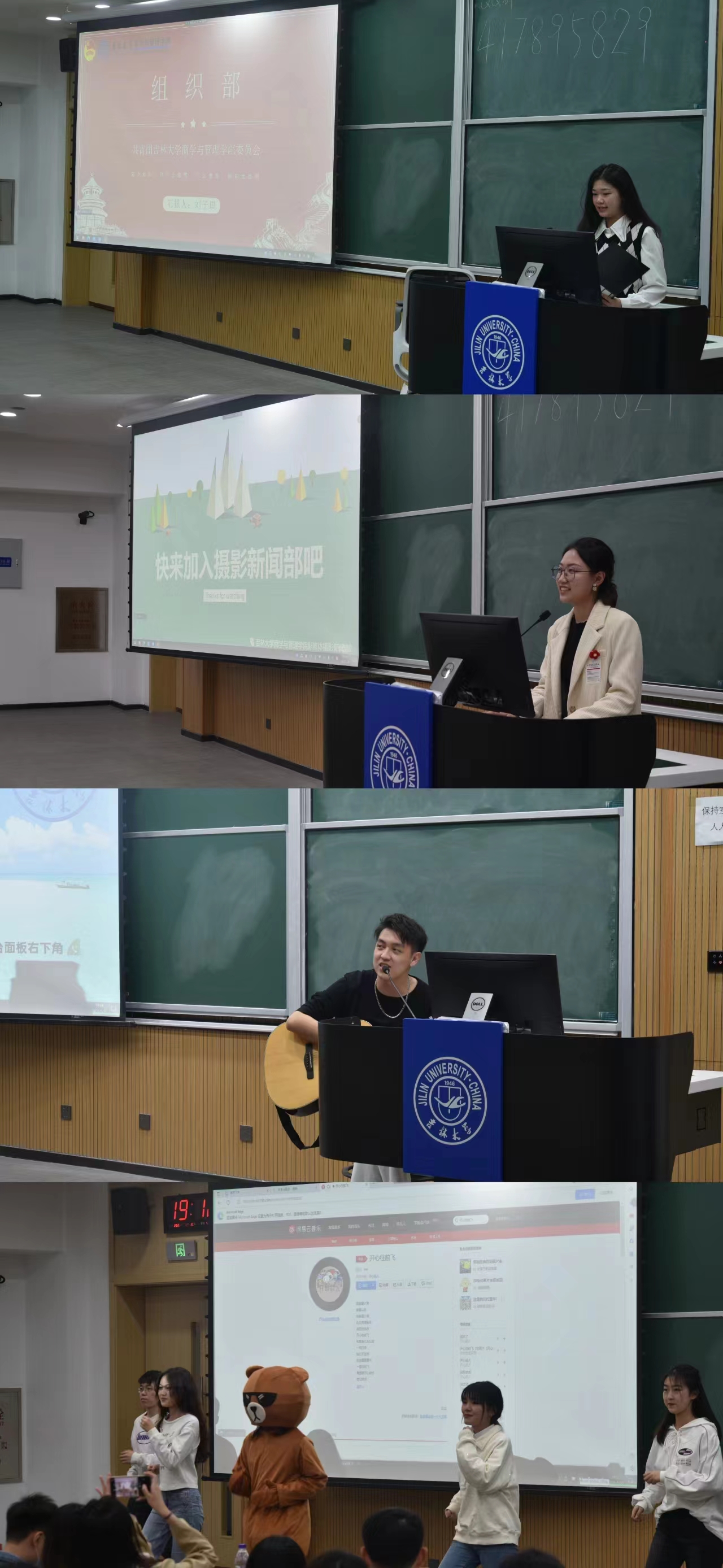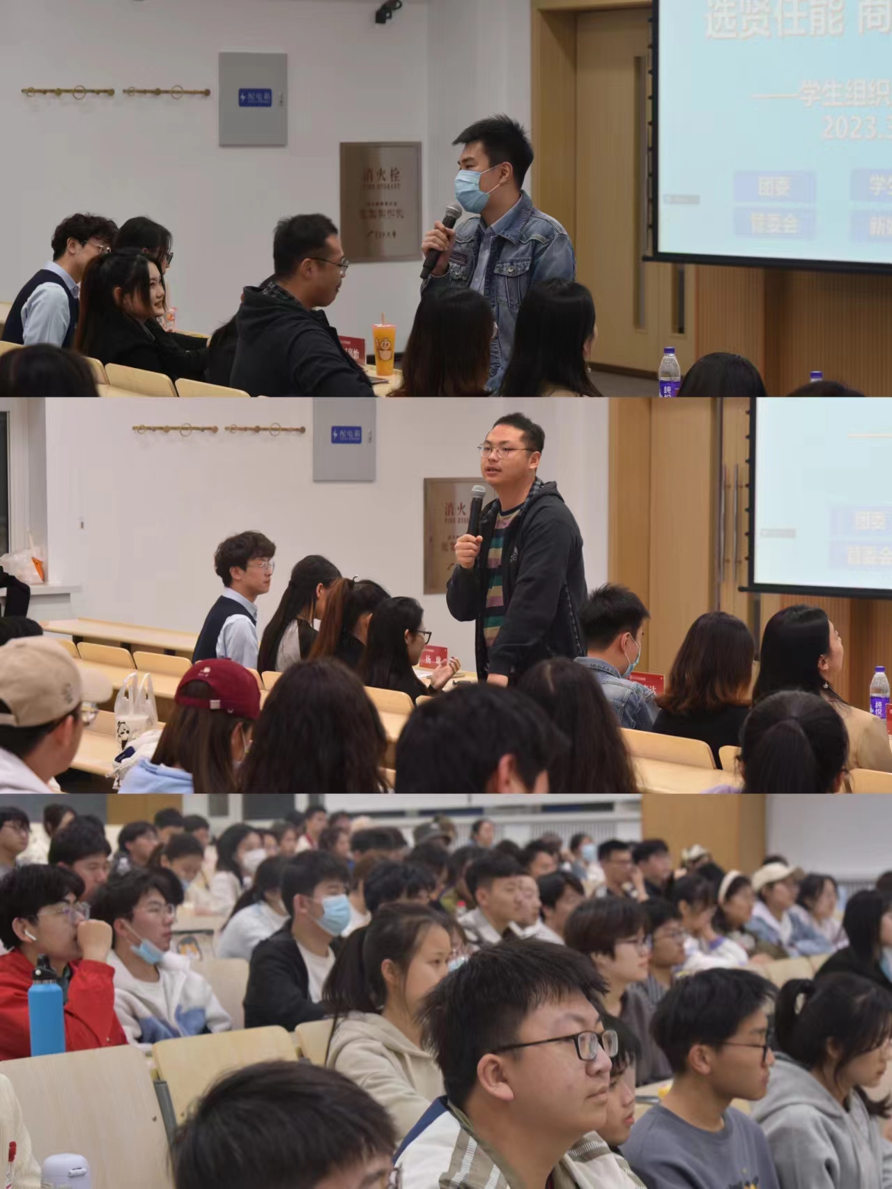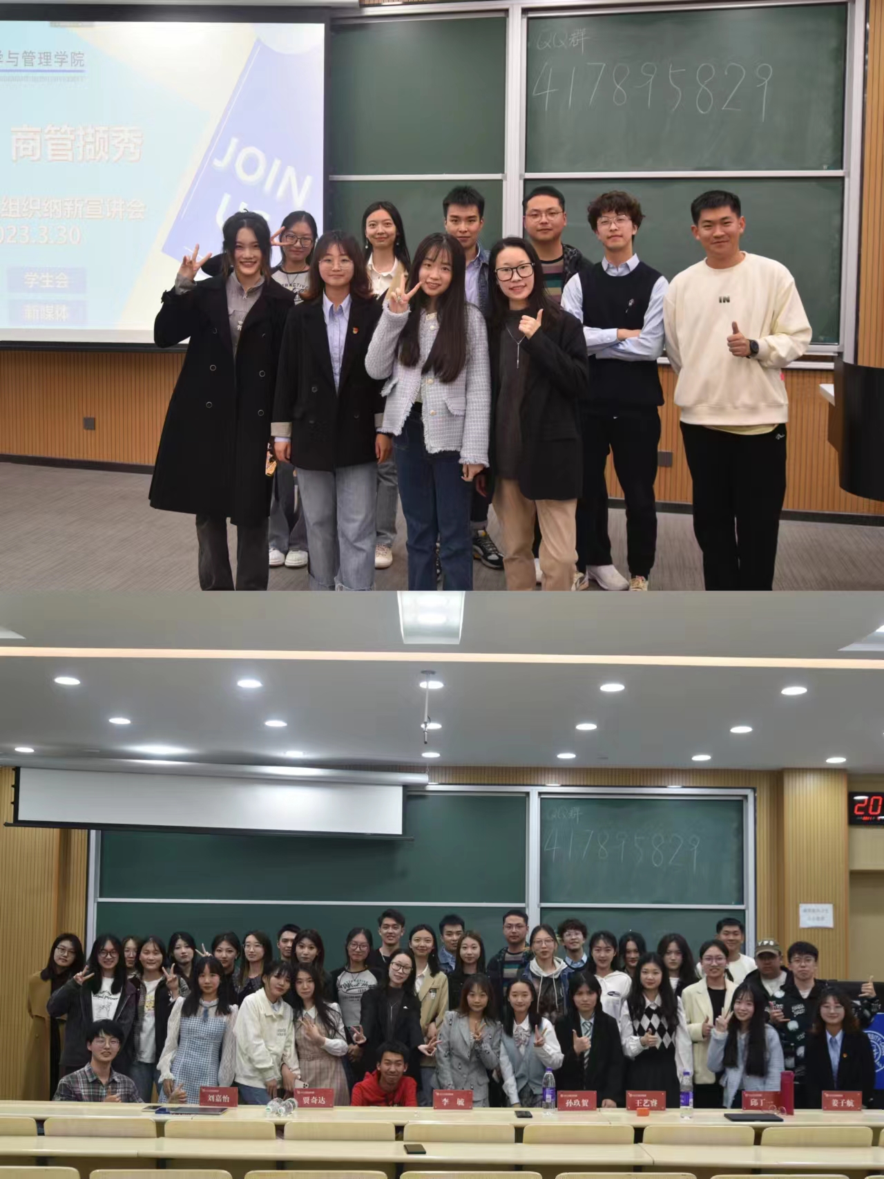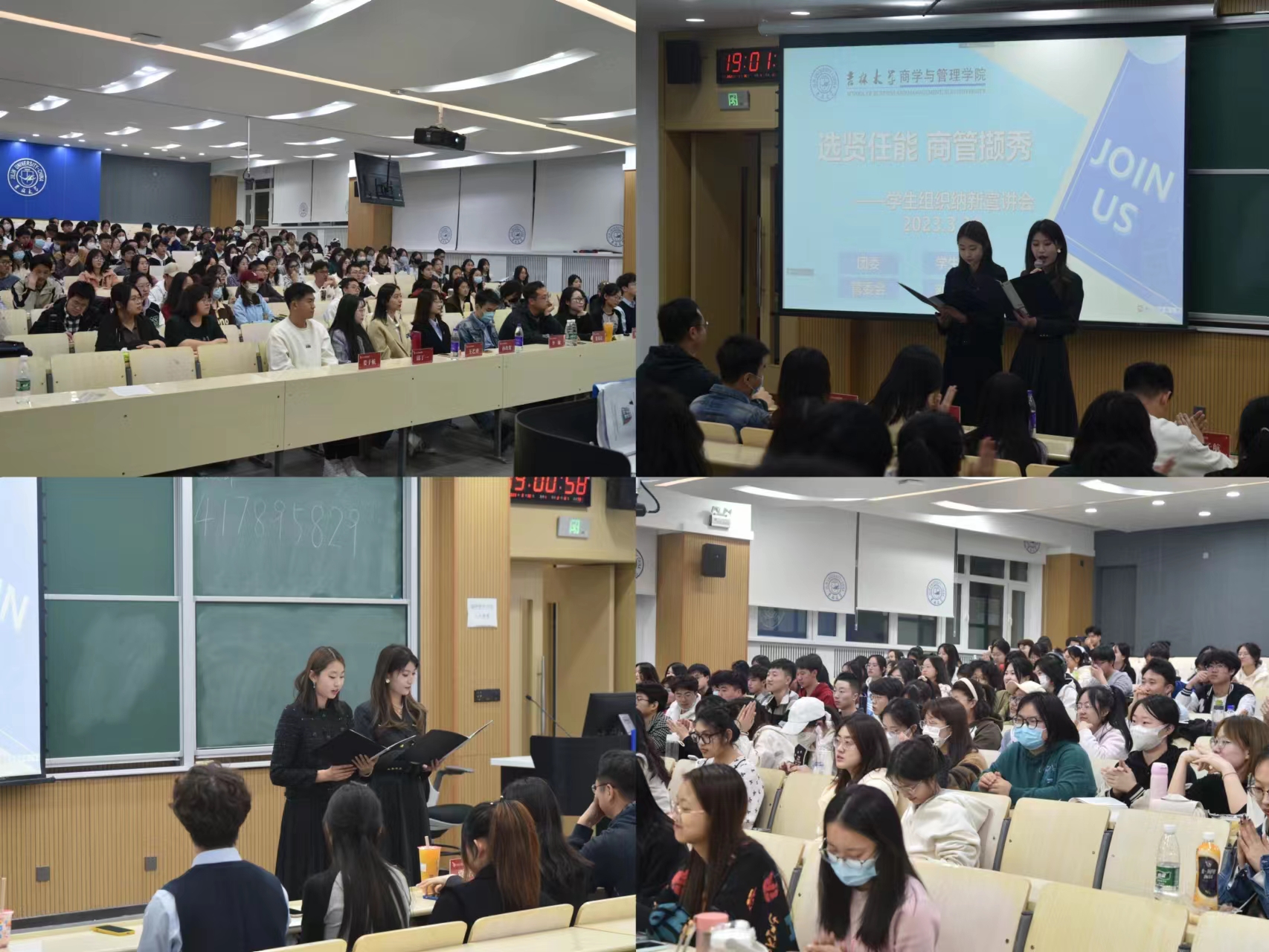 为确保公司团学组织健康有序发展,发挥组织育人功能,提高员工自我管理、自我服务能力,3月29日和3月30日晚7点,分别在逸夫楼第八阶梯教室和第十六阶梯教室举行了“选贤任能,商管撷秀——公司员工组织纳新宣讲会”,向2022级员工介绍公司员工组织架构以及各个部门的情况和招新要求。会议由团委秘书部的张笑旸和员工会校园文化部的张子楠共同主持,2022级辅导员李毓老师和贾奇达老师、团委副书记孙玖贺、王艺睿,员工会执行主席柏申苏、刘嘉怡、孙哲,管委会主任杨琳,新媒体工作站站长姜子航、邱丁一,部分员工组织部门负责人和2022级员工参加了宣讲会。
