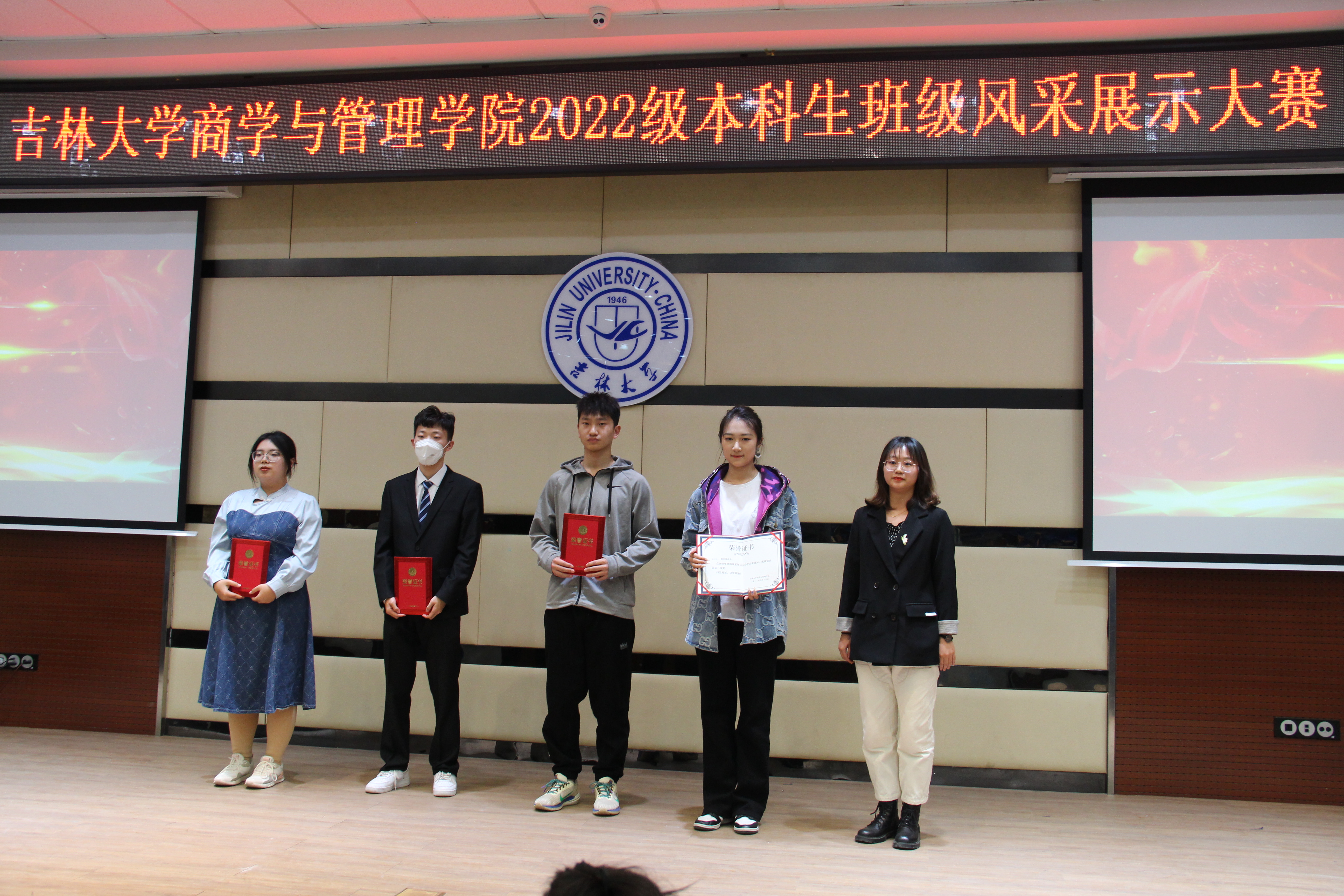 展示结束后,李毓老师和贾奇达老师对比赛进行了点评,老师对同学们的表演给予了积极的肯定,细心地做出了评价,并送出了期望与祝福。最后就是激动人心的颁奖环节:一等奖为1班、9班,二等奖为23班、21班、26班、15班,三等奖为16班、3班、25班、24班、6班、5班。至此,本次风采大会圆满结束。