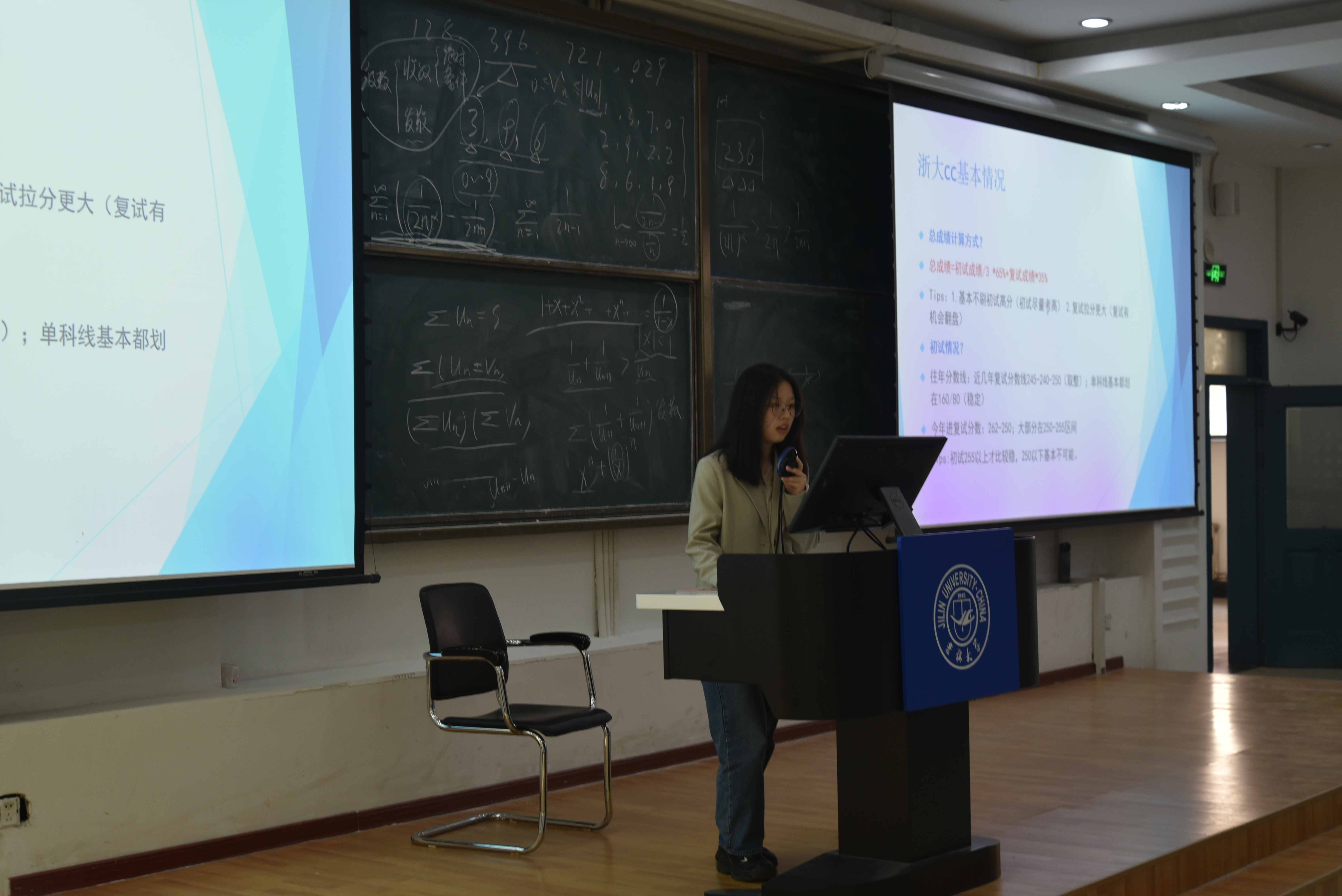 首先进行分享的是会计学的宋茗慧,学姐从自身背景、考前规划与准备和初始备考指南三个方向进行了介绍。宋茗慧学姐以自身亲身经历向大家传授了自己的备考心得,尤其在选校建议和落实考研计划两个方面多次强调,希望同学们提高重视程度。