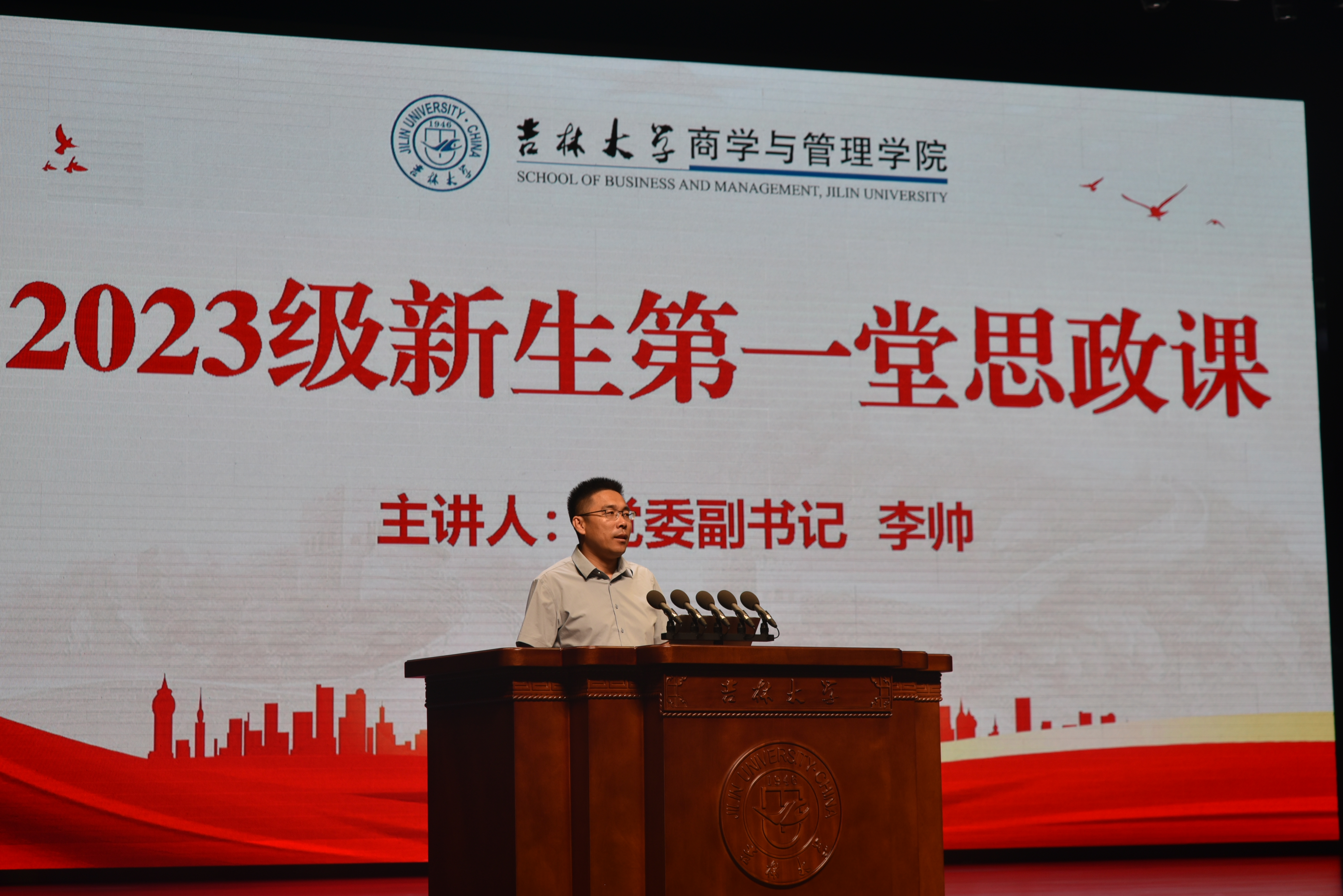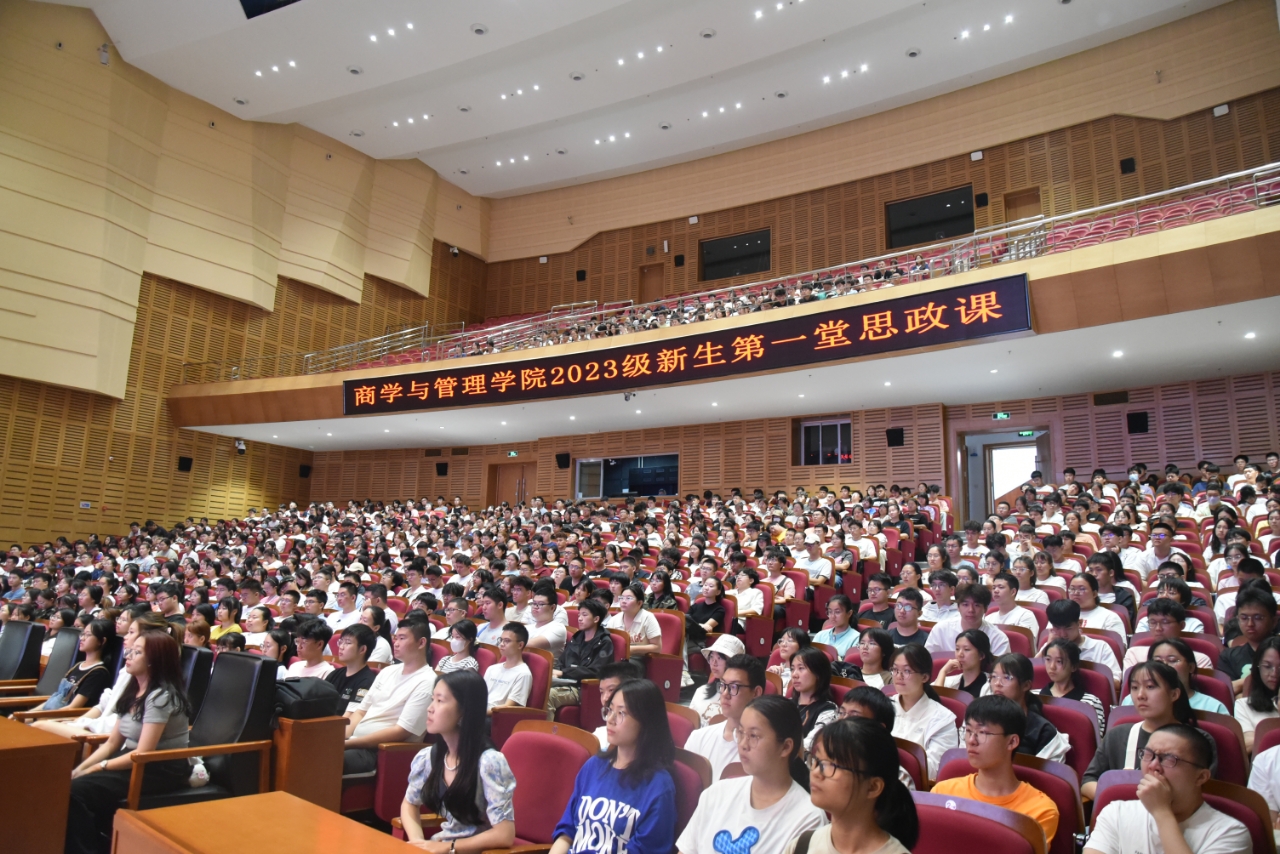 2023年8月30日上午9:30,9428cn太阳集团古天乐商学与管理公司于鼎新大讲堂开展了新生第一堂思政课,此次思政课由商学与管理公司党委副书记兼副经理李帅老师主讲,2023级全体新生参加。