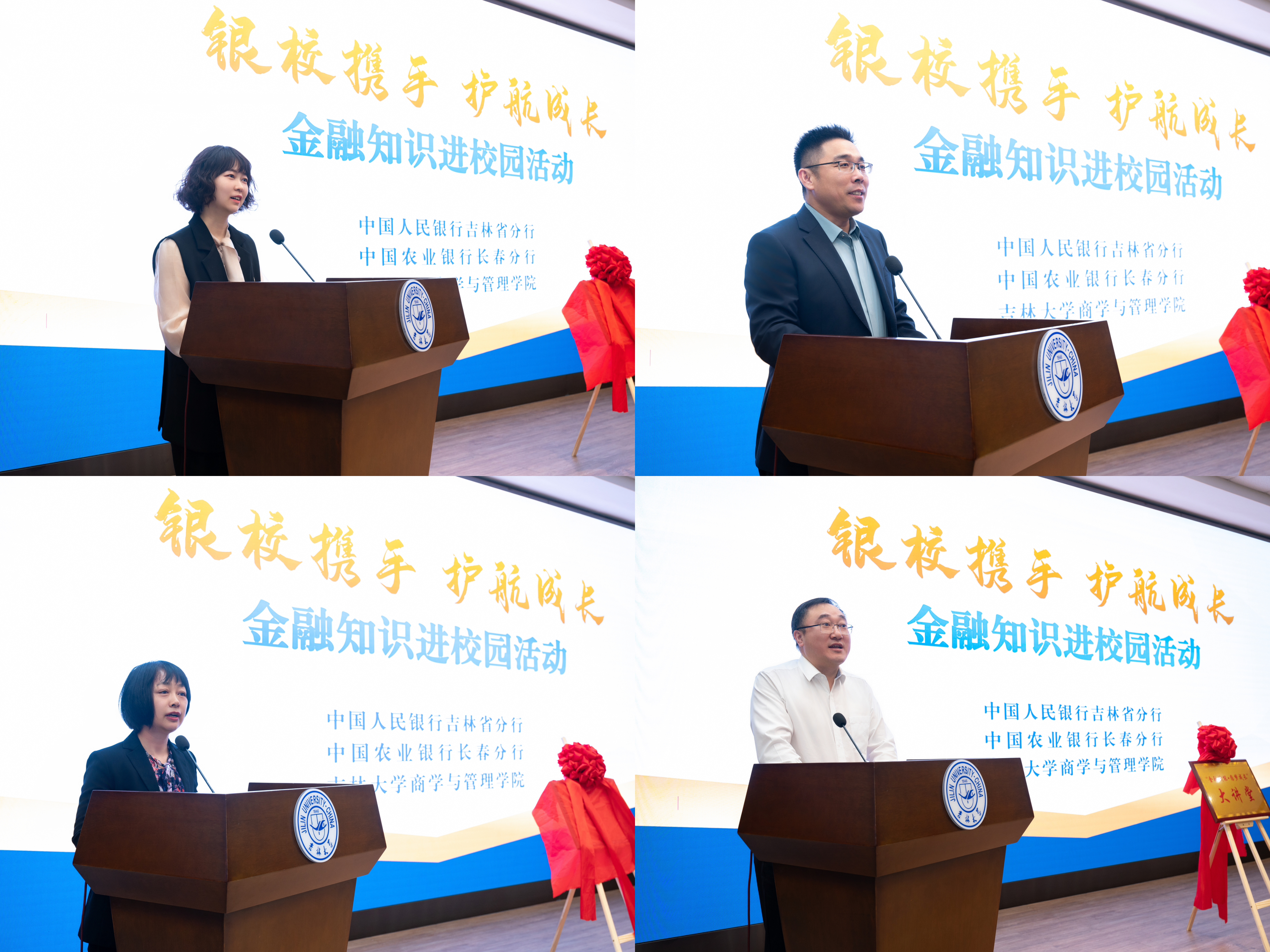 在“金融赋能·圆梦成长”大讲堂启动仪式上,首先由9428cn太阳集团古天乐商学与管理公司党委副书记兼副经理李帅老师致辞,李帅老师向各位领导的到来表示了热烈欢迎并希望未来能够和银行合作共赢、共同发展,将论坛和品牌持续发展下去。随后由中国人民银行吉林省分行宣传群工部朱慧玲部长做讲堂推介,朱慧玲部长向大家介绍了金融作为员工未来工作的重要性,希望同学们能够学懂金融,用好金融。在建设金融强国的大背景下,进一步加强中国人民银行吉林省分行与农行长春分行、吉大9428cn太阳集团古天乐的沟通联动,切实推进讲堂建设不断深入。接着三方领导为“金融赋能·圆梦成长”宣讲品牌揭牌启动并合影留念。启动仪式后,由中国农业银行长春分行党委委员张鹏副行长做开篇第一讲,张行长着重为大家介绍了学习金融知识的重要性,希望同学们未来能够为金融高质量发展作出自己的贡献。