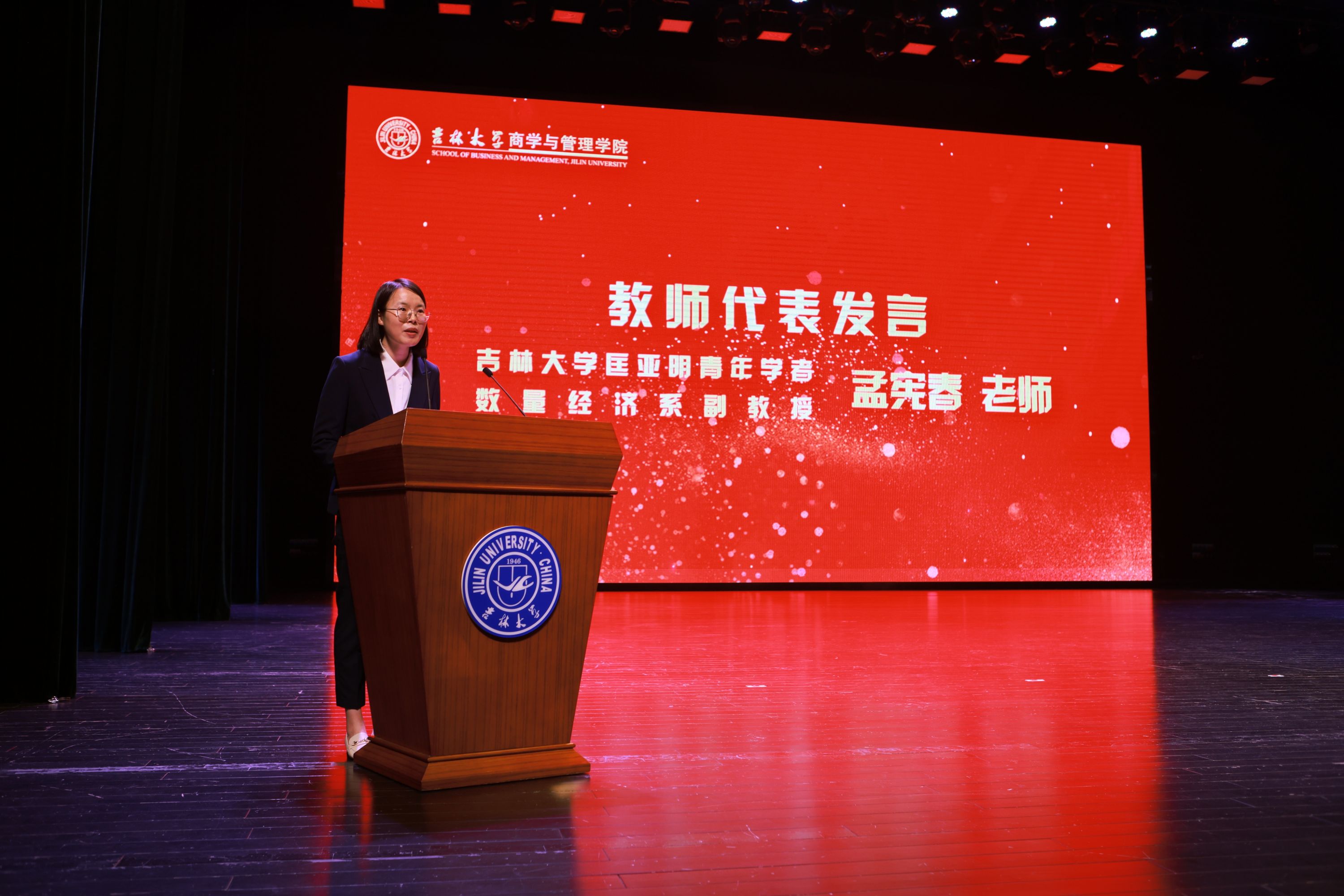 教师代表数量经济系副教授、匡亚明青年学者孟宪春老师上台发言,代表全体老师向毕业生们送上临别的寄语,并向毕业生们分享了自己的体会和期望,希望毕业生们保持专注力、开放的心态和“而已”的勇气。