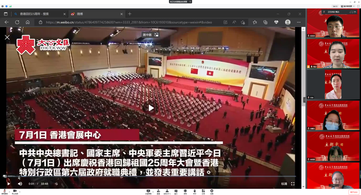 其后,甄宓老师带领全体党员观看了央视网发布的《国家好,香港会更好——写在香港回归25周年之际》主题视频,通过镜头视角进一步感受了香港在“一国两制”方针指引下蓬勃发展的壮阔篇章。