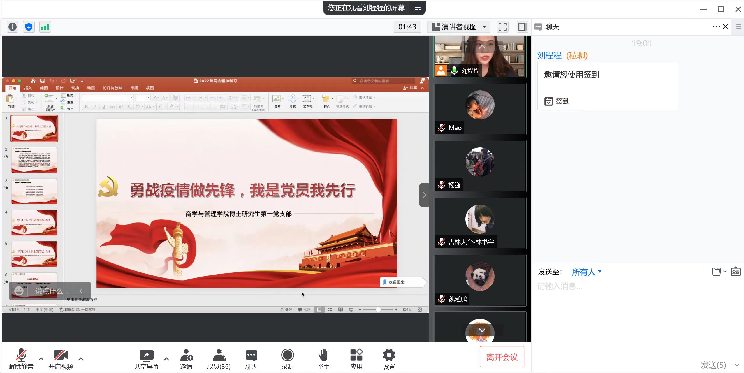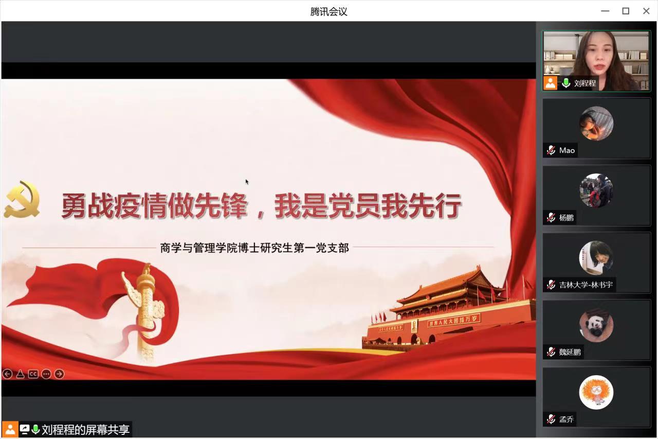 为深入贯彻落实习近平总书记关于新冠疫情防控工作的重要讲话重要指示精神,积极相应公司和公司党委号召,2022年4月27日下午7:00,9428cn太阳集团古天乐博士研究生第一党支部召开“勇战疫情做先锋,我是党员我先行”的主题党日活动,组织全体博士研究生第一党支部党员学习了习近平总书记重要讲话精神,鼓励党员同学们不畏艰难、勇担责任。本次活动由党支部书记刘程程同志主持,支部委员刘欣苗记录,支部全体党员参加。