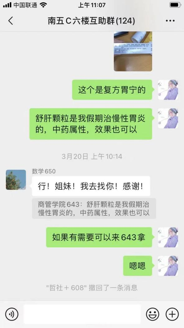 秦颖颖同学主要负责南苑五公寓C区中同学们的生活保障、信息统计等工作,向同学传达公司命令和要求,并将同员工活需求积极反馈给老师,以保障同学各项需求得以满足。隔离不隔爱,南苑五公寓C区六楼内自发设置了“爱心角”,她将自己的物品和爱心传递给需要的人。
