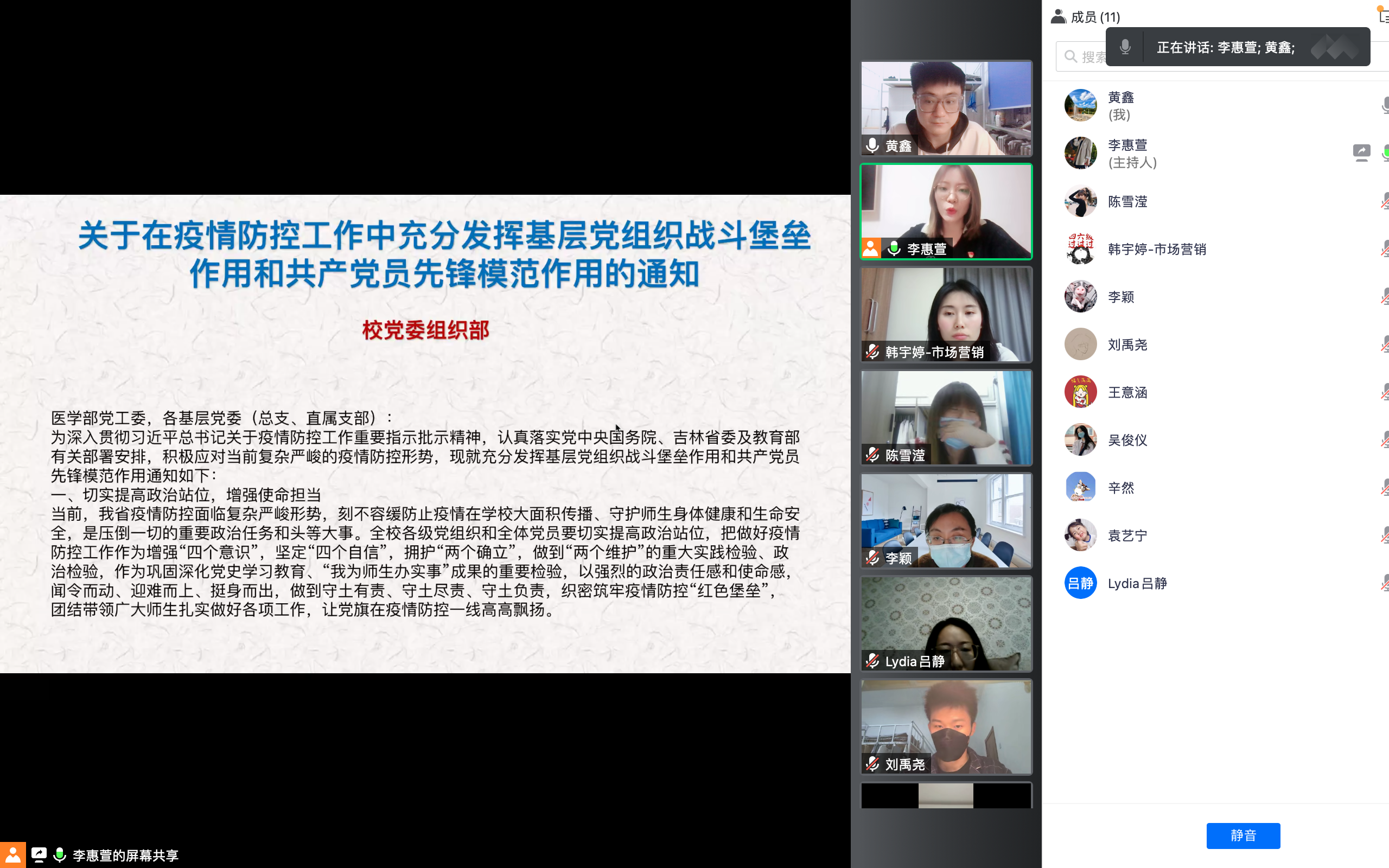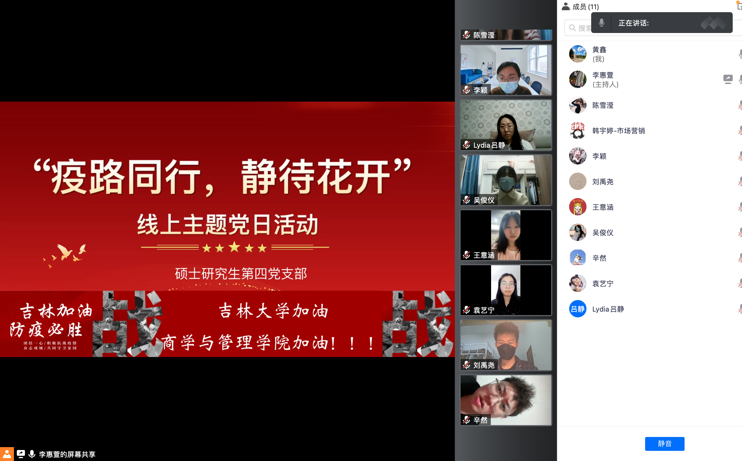 吉林省新冠肺炎疫情防控形式日益严峻,这个三月,全体吉大人以敢战必胜的勇气与决心,积极夺取疫情防控阻击战的全面胜利。为调动党员及党员干部抗疫的积极性,增强党员们带领群众打赢抗疫战的信心,9428cn太阳集团古天乐硕士研究生第四党支部于3月24日19:00,在线上腾讯会议开展了以“疫路同行 静待花开”为主题的党日活动。支部全体党员及支部参与志愿者工作的积极分子参与了此次活动。