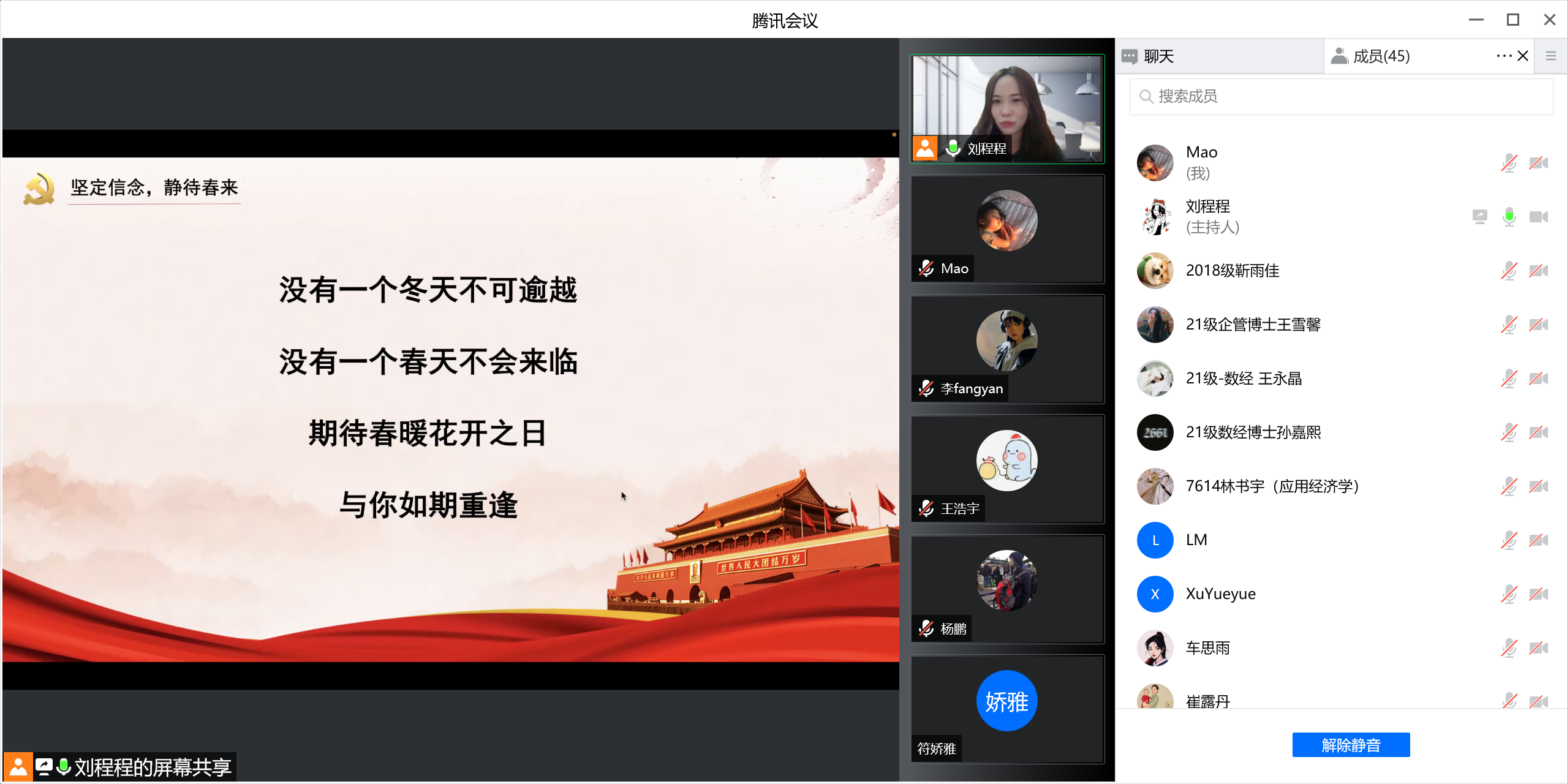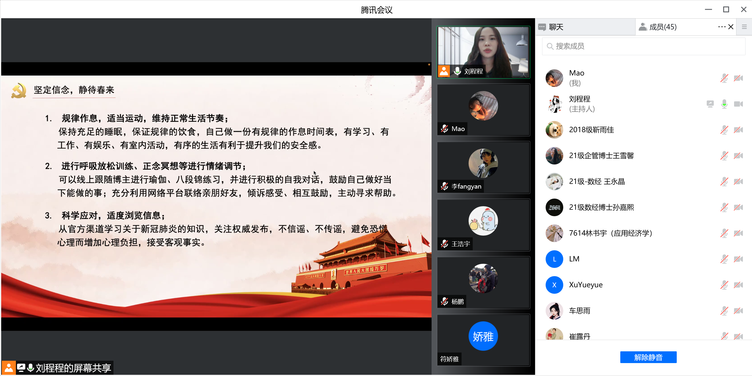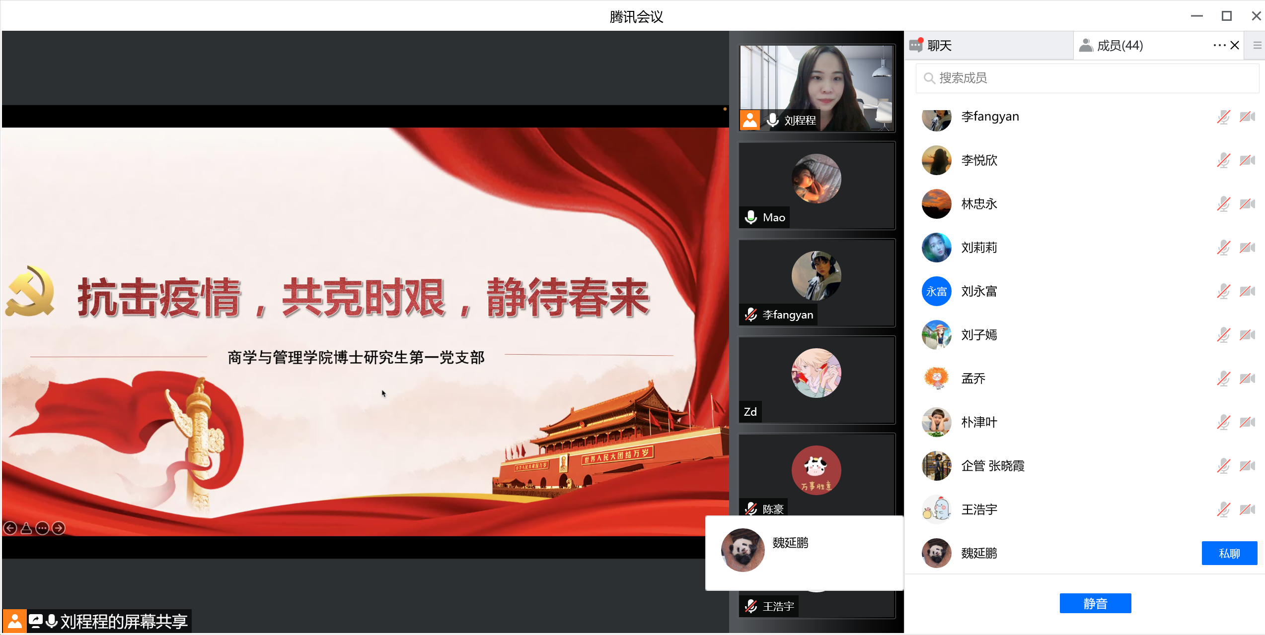 为深入贯彻习近平总书记关于疫情防控工作重要指示批示精神,积极应对当前复杂严峻的疫情防控形势,2022年3月25日,9428cn太阳集团古天乐博士研究生第一党支部召开“抗击疫情,共克时坚,静待春来”线上主题党日活动。会议由党支部书记刘程程同志主持,刘欣苗同志与谢敬轩同志记录,支部有44名党员和团员共同参加。