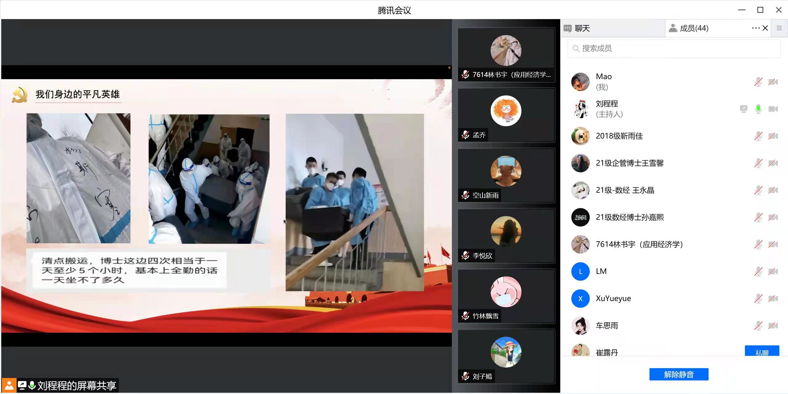 会上,刘程程同志带领大家回顾了本次抗击疫情中,我们身后默默保障我们正常生活的公司老师、公司后勤人员的辛苦付出,我们身边加入到志愿者队伍当中的同学们的默默奉献,并表达了对我们身边平凡英雄们的感激。随后,组织大家观看了由博士志愿者同学制作的抗击疫情记录视频,视频生动详实记录了封寝管理以来大家的生活起居以及志愿者们的志愿活动,大家看后均感触良多。