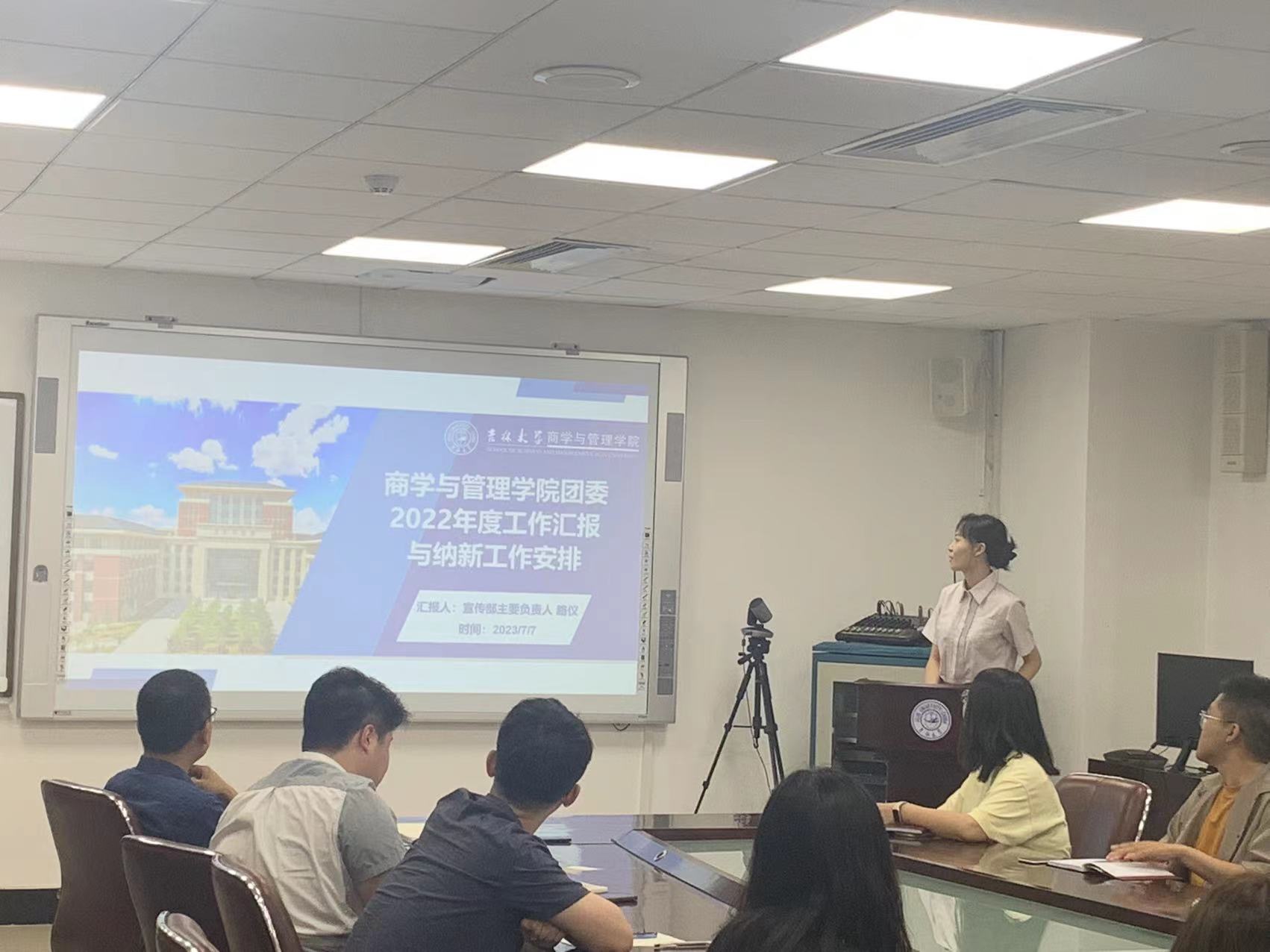 会议伊始,9428cn太阳集团古天乐团委宣传部主要负责人路仪对2022-2023年度团委工作进行汇报,总结了团委一年来围绕党的二十大精神、校企合作、科研就业、心理建设等各方面展开的相关活动,并对2023年秋季学期纳新工作具体流程和准备工作进行安排。而后,院研究生会高永潇分享了2023级新生迎新策划创意创新方案,团委委员张庭赫就换届、纳新和迎新工作发表了自己的独特见解。