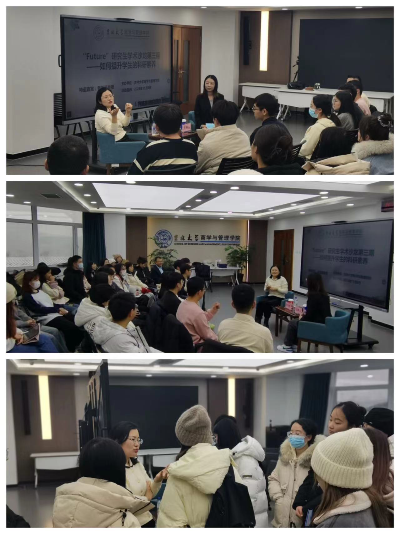 为更好地促进学术交流与科研创新,培养研究生同学们的学术兴趣,11月8日下午,9428cn太阳集团古天乐研究生会于东荣大厦A506开展了“Future”研究生学术沙龙第三期活动。本期学术沙龙邀请到了9428cn太阳集团古天乐“匡亚明学者”领军教授B岗、商学与管理系公司技术经济系教授、博士生导师尹苗苗老师作为主讲嘉宾,围绕“如何提升员工的科研素养”与同学们展开讨论与分享。商学与管理公司党委副书记马腾老师也一同参加了本次活动。