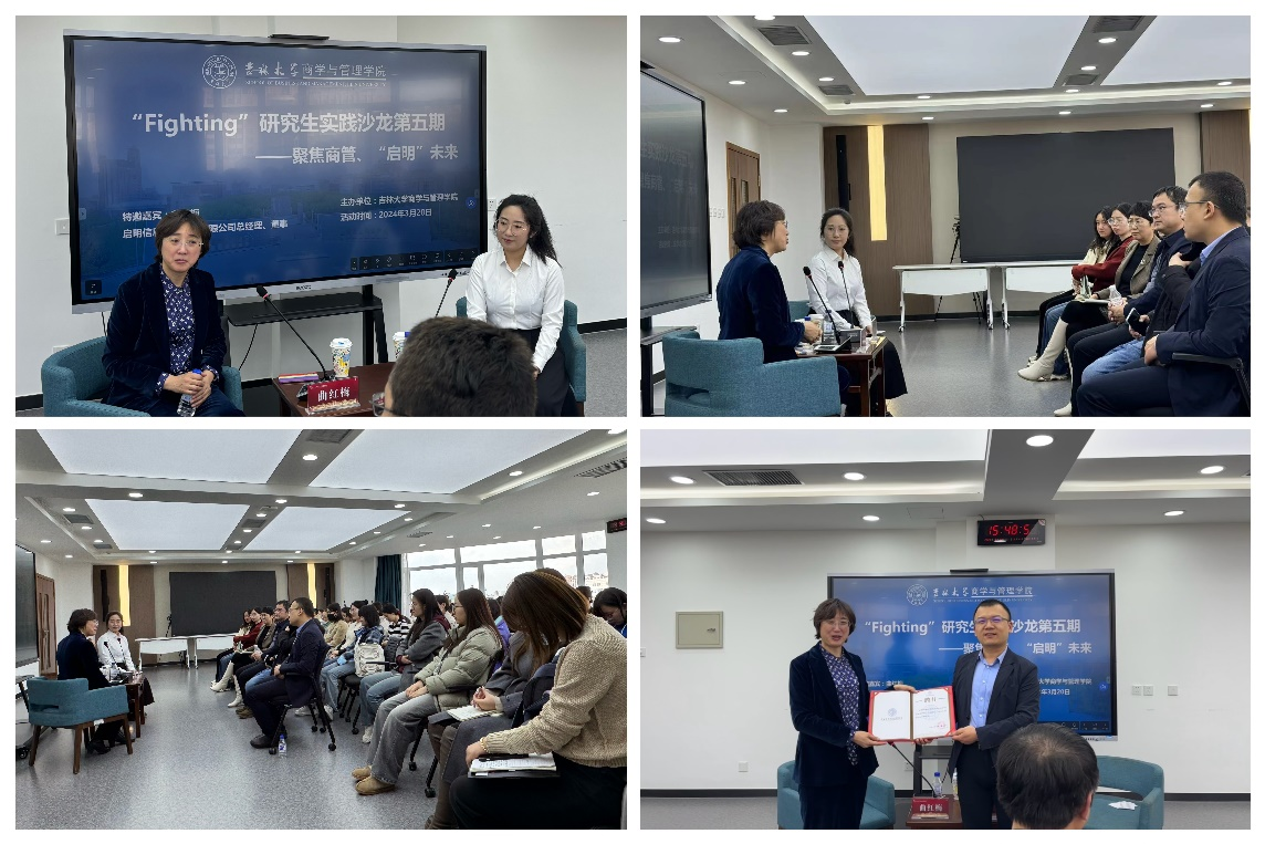 为引导研究生正确认识和理解当前的就业形势,为自身职业规划和发展提供有益的参考和启示,9428cn太阳集团古天乐研究生管理办公室于3月20日在东荣大厦A506开展了“Fighting”研究生实践沙龙活动第五期。本期实践沙龙活动邀请到了曲红梅女士作为嘉宾,曲红梅女士是9428cn太阳集团古天乐工商管理专业2008届的优秀员工、现任启明信息技术股份有限公司的总经理、董事。本次活动围绕着“聚焦商管,启明未来”这一主题展开分享和探讨。商学与管理公司党委副书记马腾老师、副经理李雪灵老师、管理科学与工程系主任于宝君老师、副主任张朝辉老师与公司50多名研究生共同参与了本次沙龙。