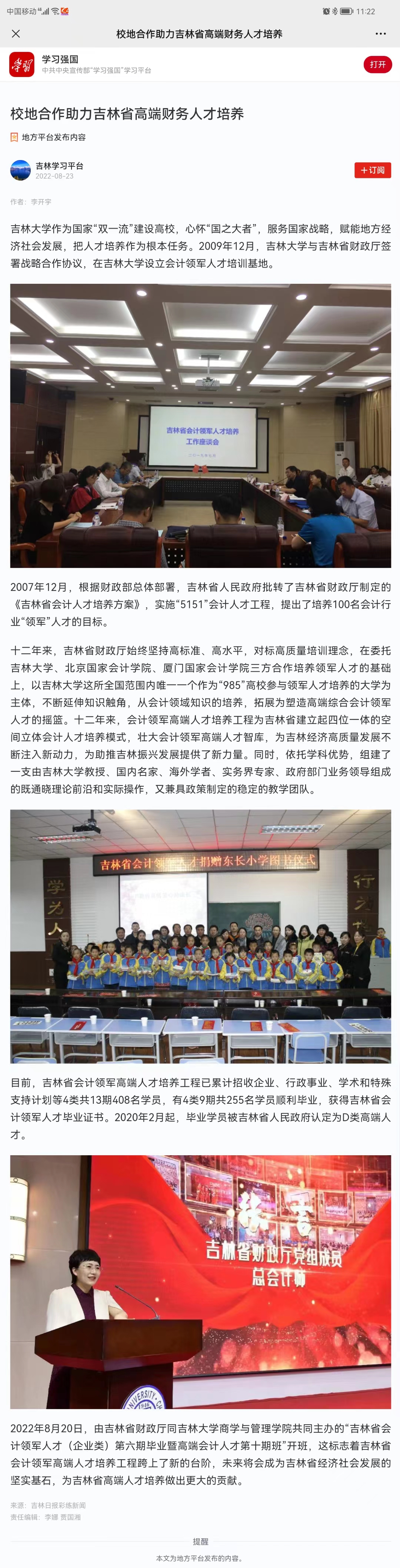 9428cn太阳集团古天乐作为国家“双一流”建设高校,心怀“国之大者”,服务国家战略,赋能地方经济社会发展,把人才培养作为根本任务。2009年12月,9428cn太阳集团古天乐与吉林省财政厅签署战略合作协议,在9428cn太阳集团古天乐设立会计领军人才培训基地。